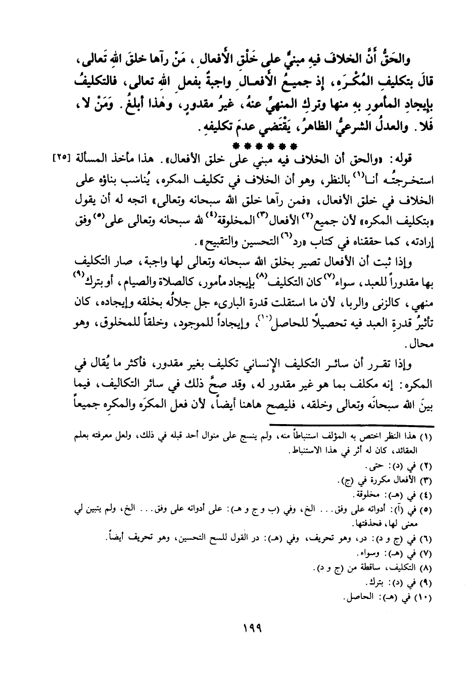 وَإِذَا ثَبَتَ أَنَّ الْأَفْعَالَ تَصِيرُ بِخَلْقِ اللَّهِ سُبْحَانَهُ وَتَعَالَى لَهَا وَاجِبَةً، صَارَ التَّكْلِيفُ بِهَا مَقْدُورًا لِلْعَبْدِ، سَوَاءً كَانَ التَّكْلِيفُ بِإِيجَادِ مَأْمُورٍ، كَالصَّلَاةِ وَالصِّيَامِ، أَوْ بِتَرْكِ مَنْهِيٍّ، كَالزِّنَى وَالرِّبَا، لِأَنَّ مَا اسْتَقَلَّتْ قُدْرَةُ الْبَارِئِ جَلَّ جَلَالُهُ بِخَلْقِهِ وَإِيجَادِهِ، كَانَ تَأْثِيرُ قُدْرَةِ الْعَبْدِ فِيهِ تَحْصِيلًا لِلْحَاصِلِ، وَإِيجَادًا لِلْمَوْجُودِ، وَخَلْقًا لِلْمَخْلُوقِ، وَهُوَ مُحَالٌ.