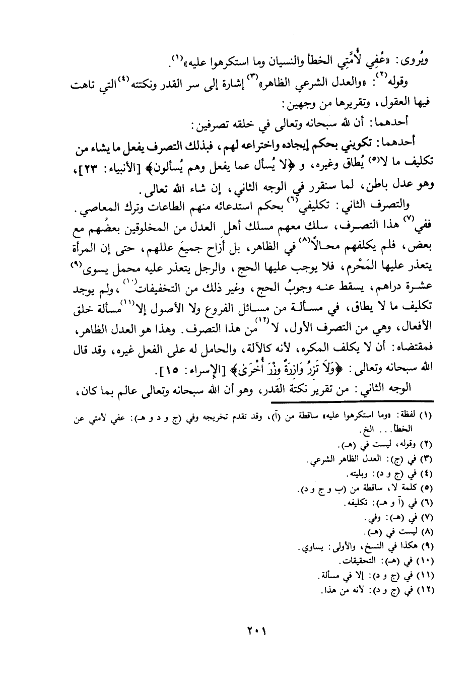فَفِي هَذَا التَّصَرُّفِ، سَلَكَ مَعَهُمْ مَسْلَكَ أَهْلِ الْعَدْلِ مِنَ الْمَخْلُوقِينَ بَعْضُهُمْ مَعَ بَعْضٍ، فَلَمْ يُكَلِّفْهُمْ مُحَالًا فِي الظَّاهِرِ، بَلْ أَزَاحَ جَمِيعَ عِلَلِهِمْ، حَتَّى إِنَّ الْمَرْأَةَ يَتَعَذَّرُ عَلَيْهَا الْمَحْرَمُ، فَلَا يُوجَبُ عَلَيْهَا الْحَجُّ، وَالرَّجُلُ يَتَعَذَّرُ عَلَيْهِ مَحْمَلٌ يَسْوي عَشَرَةَ دَرَاهِمَ، يَسْقُطُ عَنْهُ وُجُوبُ الْحَجِّ، وَغَيْرُ ذَلِكَ مِنَ التَّخْفِيفَاتِ، وَلَمْ يُوجَدْ تَكْلِيفُ مَا لَا يُطَاقُ، فِي مَسْأَلَةٍ مِنْ مَسَائِلِ الْفُرُوعِ وَلَا الْأُصُولِ إِلَّا مَسْأَلَةَ خَلْقِ الْأَفْعَالِ، وَهِيَ مِنَ التَّصَرُّفِ الْأَوَّلِ، لَا مِنْ هَذَا التَّصَرُّفِ. وَهَذَا هُوَ الْعَدْلُ الظَّاهِرُ، فَمُقْتَضَاهُ: أَنْ لَا يُكَلَّفَ الْمُكْرَهُ، لِأَنَّهُ كَالْآلَةِ، وَالْحَامِلُ لَهُ عَلَى الْفِعْلِ غَيْرُهُ، وَقَدْ قَالَ اللَّهُ سُبْحَانَهُ وَتَعَالَى: {وَلَا تَزِرُ وَازِرَةٌ وِزْرَ أُخْرَى} [الْإِسْرَاءِ: 15] .