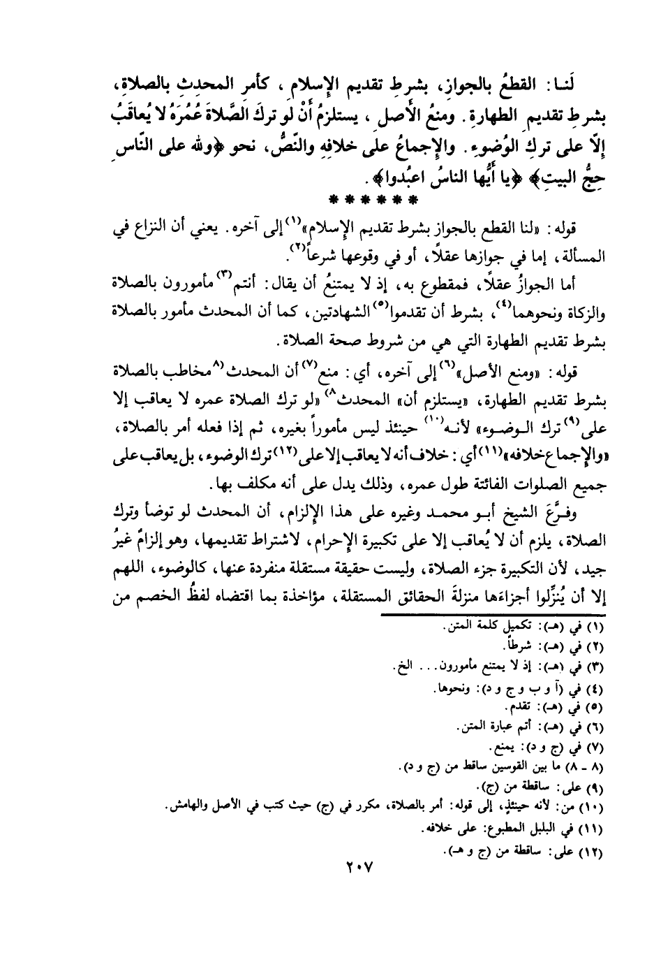 قَوْلُهُ: «وَمَنْعُ الْأَصْلِ» إِلَى آخِرِهِ، أَيْ: مَنْعُ أَنَّ الْمُحْدِثَ مُخَاطَبٌ بِالصَّلَاةِ بِشَرْطِ تَقْدِيمِ الطَّهَارَةِ، «يَسْتَلْزِمُ أَنَّ» الْمُحْدِثَ «لَوْ تَرَكَ الصَّلَاةَ عُمْرَهُ لَا يُعَاقَبُ إِلَّا عَلَى تَرْكِ الْوُضُوءِ» لِأَنَّهُ حِينَئِذٍ لَيْسَ مَأْمُورًا بِغَيْرِهِ، ثُمَّ إِذَا فَعَلَهُ أُمِرَ بِالصَّلَاةِ «وَالْإِجْمَاعُ خِلَافُهُ» أَيْ: خِلَافُ أَنَّهُ لَا يُعَاقَبُ إِلَّا عَلَى تَرْكِ الْوُضُوءِ، بَلْ يُعَاقَبُ عَلَى جَمِيعِ الصَّلَوَاتِ الْفَائِتَةِ طُولَ عُمْرِهِ، وَذَلِكَ يَدُلُّ عَلَى أَنَّهُ مُكَلَّفٌ بِهَا.