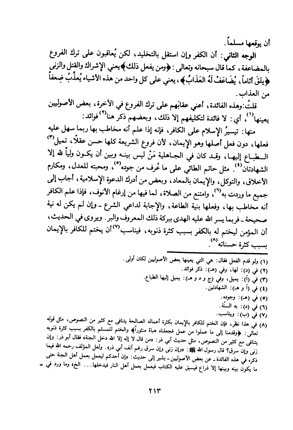 الْوَجْهُ الثَّانِي: أَنَّ الْكُفْرَ وَإِنِ اسْتَقَلَّ بِالتَّخْلِيدِ، لَكِنْ يُعَاقَبُونَ عَلَى تَرْكِ الْفُرُوعِ بِالْمُضَاعَفَةِ، كَمَا قَالَ سُبْحَانَهُ وَتَعَالَى: {وَمَنْ يَفْعَلْ ذَلِكَ} يَعْنِي الْإِشْرَاكَ وَالْقَتْلَ وَالزِّنَى {يَلْقَ أَثَامًا} {يُضَاعَفْ لَهُ الْعَذَابُ} ، يَعْنِي عَلَى كُلِّ وَاحِدٍ مِنْ هَذِهِ الْأَشْيَاءِ يُعَذَّبُ ضِعْفًا مِنَ الْعَذَابِ.