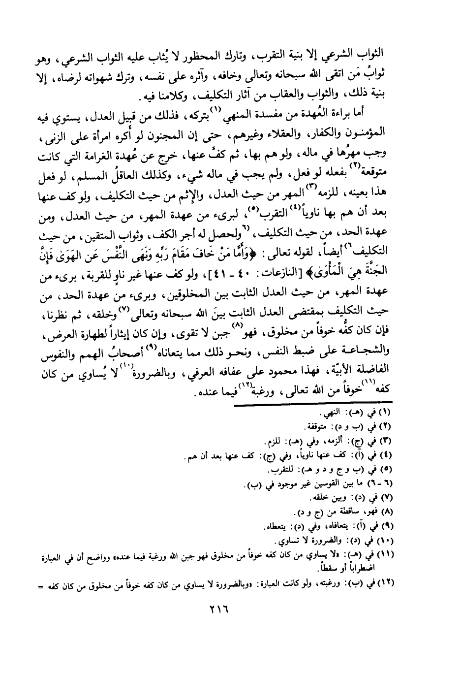 أَمَّا بَرَاءَةُ الْعُهْدَةِ مِنْ مَفْسَدَةِ الْمَنْهِيِّ بِتَرْكِهِ، فَذَلِكَ مِنْ قَبِيلِ الْعَدْلِ، يَسْتَوِي فِيهِ الْمُؤْمِنُونَ وَالْكُفَّارُ، وَالْعُقَلَاءُ وَغَيْرُهُمْ، حَتَّى إِنَّ الْمَجْنُونَ لَوْ أَكْرَهَ امْرَأَةً عَلَى الزِّنَى، وَجَبَ مَهْرُهَا فِي مَالِهِ، وَلَوْ هَمَّ بِهَا، ثُمَّ كَفَّ عَنْهَا، خَرَجَ عَنْ عُهْدَةِ الْغَرَامَةِ الَّتِي كَانَتْ مُتَوَقَّعَةً بِفِعْلِهِ لَوْ فَعَلَ، وَلَمْ يَجِبْ فِي مَالِهِ شَيْءٌ، وَكَذَلِكَ الْعَاقِلُ الْمُسْلِمُ، لَوْ فَعَلَ هَذَا بِعَيْنِهِ، لَلَزِمَهُ الْمَهْرُ مِنْ حَيْثُ الْعَدْلِ، وَالْإِثْمُ مِنْ حَيْثُ التَّكْلِيفِ، وَلَوْ كَفَّ عَنْهَا بَعْدَ أَنْ هَمَّ بِهَا نَاوِيًا التَّقَرُّبَ، لَبَرِئَ مِنْ عُهْدَةِ الْمَهْرِ، مِنْ حَيْثُ الْعَدْلِ، وَمِنْ عُهْدَةِ الْحَدِّ، مِنْ حَيْثُ التَّكْلِيفِ، وَلَحَصَلَ لَهُ أَجْرُ الْكَفِّ، وَثَوَابُ الْمُتَّقِينَ، مِنْ حَيْثُ التَّكْلِيفِ أَيْضًا، لِقَوْلِهِ تَعَالَى: {وَأَمَّا مَنْ خَافَ مَقَامَ رَبِّهِ وَنَهَى النَّفْسَ عَنِ الْهَوَى} {فَإِنَّ الْجَنَّةَ هِيَ الْمَأْوَى} [النَّازِعَاتِ: 40 - 41] ، وَلَوْ كَفَّ عَنْهَا غَيْرَ نَاوٍ لِلْقُرْبَةِ، بَرِئَ مِنْ عُهْدَةِ الْمَهْرِ، مِنْ حَيْثُ الْعَدْلِ الثَّابِتِ بَيْنَ الْمَخْلُوقِينَ، وَبَرِئَ مِنْ عُهْدَةِ الْحَدِّ، مِنْ حَيْثُ التَّكْلِيفِ بِمُقْتَضَى الْعَدْلِ الثَّابِتِ بَيْنَ اللَّهِ سُبْحَانَهُ وَتَعَالَى وَخَلْقِهِ، ثُمَّ نَظَرْنَا، فَإِنْ كَانَ كَفُّهُ خَوْفًا مِنْ مَخْلُوقٍ، فَهُوَ جُبْنٌ لَا تَقْوَى، وَإِنْ كَانَ إِيثَارًا لِطَهَارَةِ الْعِرْضِ، وَالشَّجَاعَةِ عَلَى ضَبْطِ النَّفْسِ، وَنَحْوِ ذَلِكَ مِمَّا يَتَعَافَاهُ أَصْحَابُ الْهِمَمِ وَالنُّفُوسِ الْفَاضِلَةِ الْأَبِيَّةِ، فَهَذَا مَحْمُودٌ عَلَى عَفَافِهِ الْعُرْفِيِّ، وَبِالضَّرُورَةِ لَا يُسَاوِي مَنْ كَانَ كَفُّهُ خَوْفًا مِنَ اللَّهِ تَعَالَى، وَرَغْبَةً فِيمَا عِنْدَهُ.
