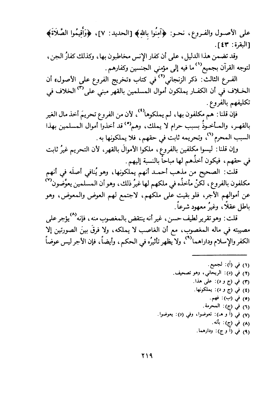 الْفَرْعُ الثَّالِثُ: ذَكَرَ الزَّنْجَانِيُّ فِي كِتَابِ «تَخْرِيجِ الْفُرُوعِ عَلَى الْأُصُولِ» أَنَّ الْخِلَافَ فِي أَنَّ الْكُفَّارَ يَمْلِكُونَ أَمْوَالَ الْمُسْلِمِينَ بِالْقَهْرِ مَبْنِيٌّ عَلَى الْخِلَافِ فِي تَكْلِيفِهِمْ بِالْفُرُوعِ.
