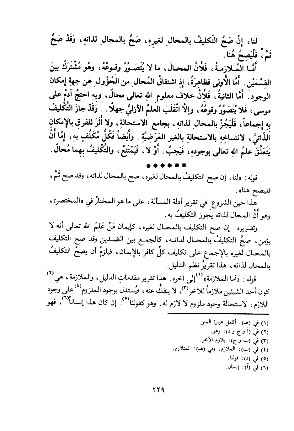 هَذَا حِينَ الشُّرُوعِ فِي تَقْرِيرِ أَدِلَّةِ الْمَسْأَلَةِ، عَلَى مَا هُوَ الْمُخْتَارُ فِي «الْمُخْتَصَرِ» ، وَهُوَ أَنَّ الْمُحَالَ لِذَاتِهِ يَجُوزُ التَّكْلِيفُ بِهِ.