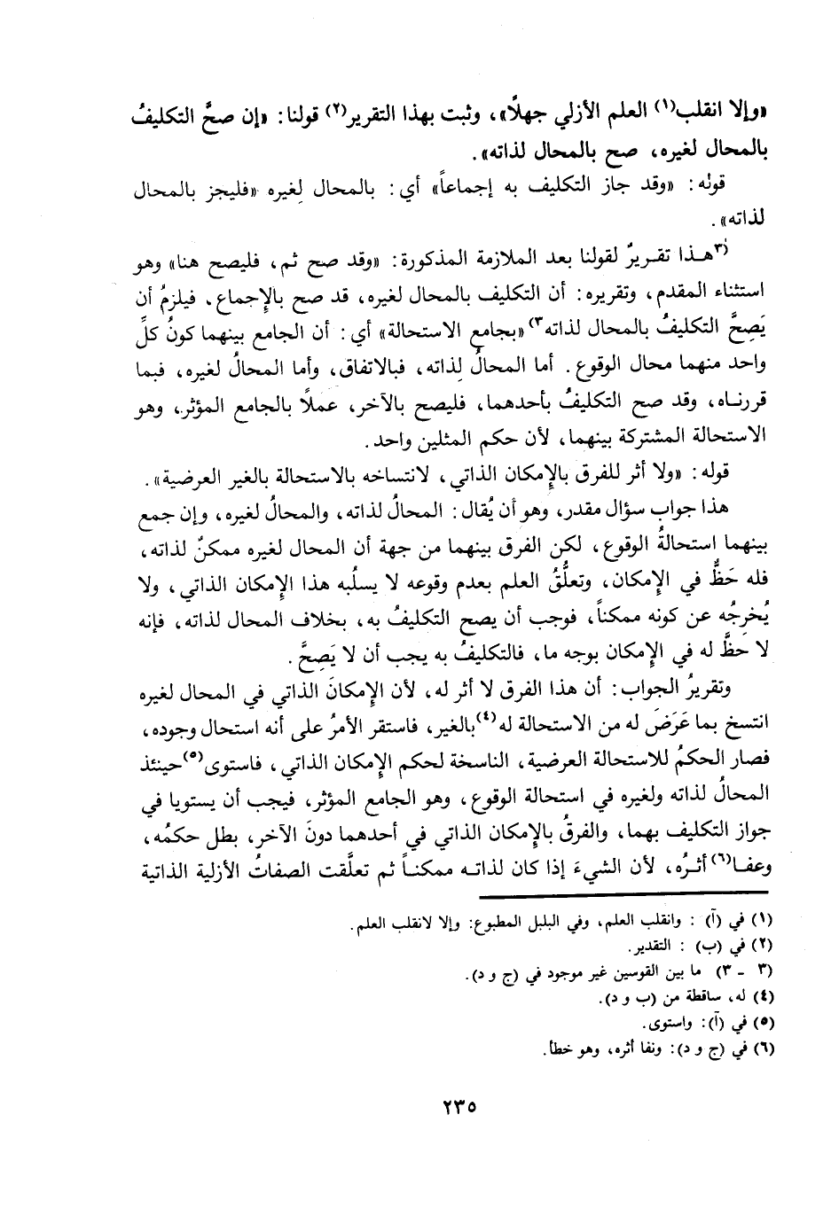 «وَإِلَّا انْقَلَبَ الْعِلْمُ الْأَزَلِيُّ جَهْلًا» ، وَثَبَتَ بِهَذَا التَّقْرِيرِ قَوْلُنَا: «إِنْ صَحَّ التَّكْلِيفُ بِالْمُحَالِ لِغَيْرِهِ، صَحَّ بِالْمُحَالِ لِذَاتِهِ» .