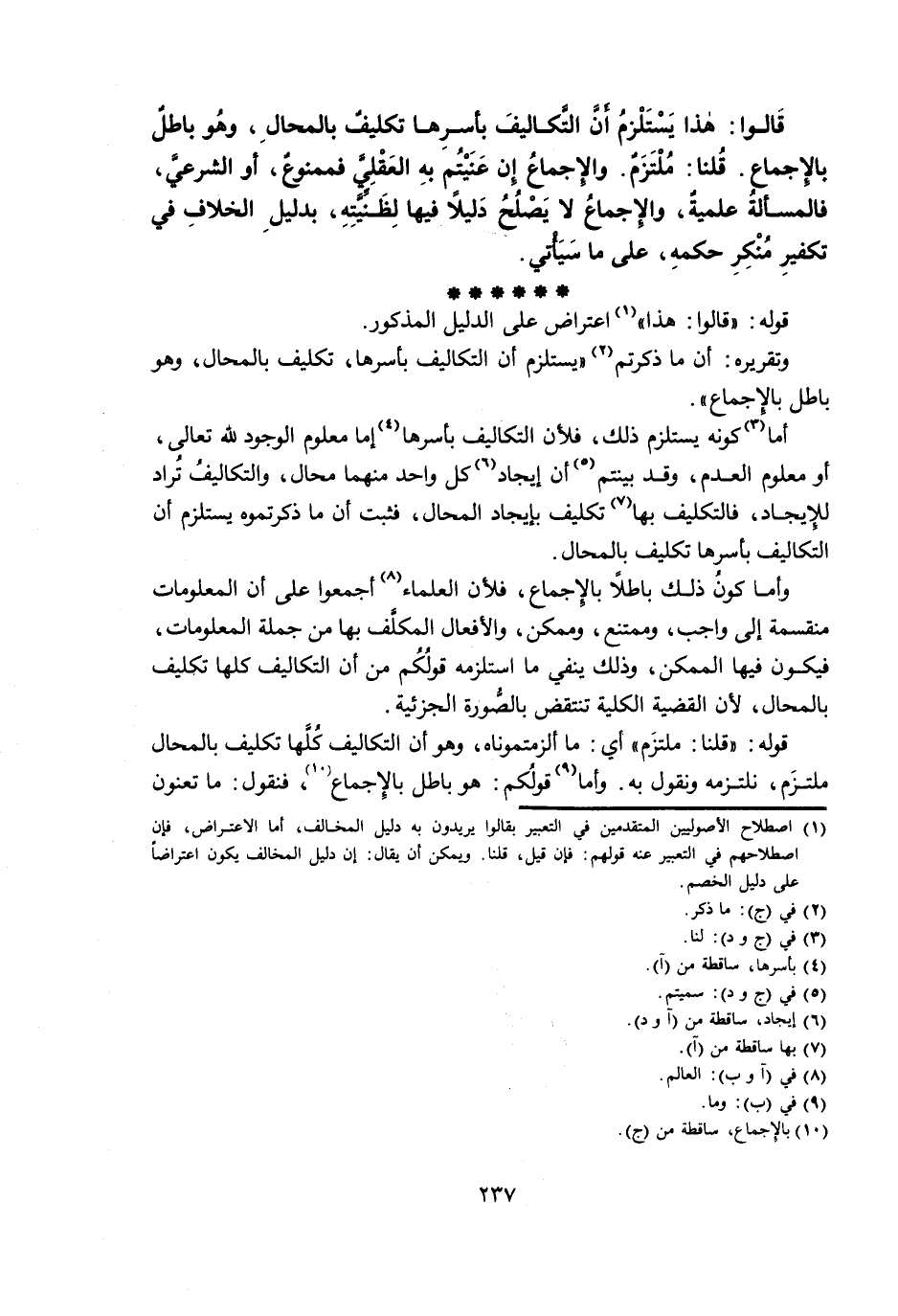 وَأَمَّا كَوْنُ ذَلِكَ بَاطِلًا بِالْإِجْمَاعِ، فَلِأَنَّ الْعُلَمَاءَ أَجْمَعُوا عَلَى أَنَّ الْمَعْلُومَاتِ مُنْقَسِمَةٌ إِلَى وَاجِبٍ، وَمُمْتَنِعٍ، وَمُمْكِنٍ، وَالْأَفْعَالُ الْمُكَلَّفُ بِهَا مِنْ جُمْلَةِ الْمَعْلُومَاتِ، فَيَكُونُ فِيهَا الْمُمْكِنُ، وَذَلِكَ يَنْفِي مَا اسْتَلْزَمَهُ قَوْلُكُمْ مِنْ أَنَّ التَّكَالِيفَ كُلَّهَا تَكْلِيفٌ بِالْمُحَالِ، لِأَنَّ الْقَضِيَّةَ الْكُلِّيَّةَ تَنْتَقِضُ بِالصُّورَةِ الْجُزْئِيَّةِ.