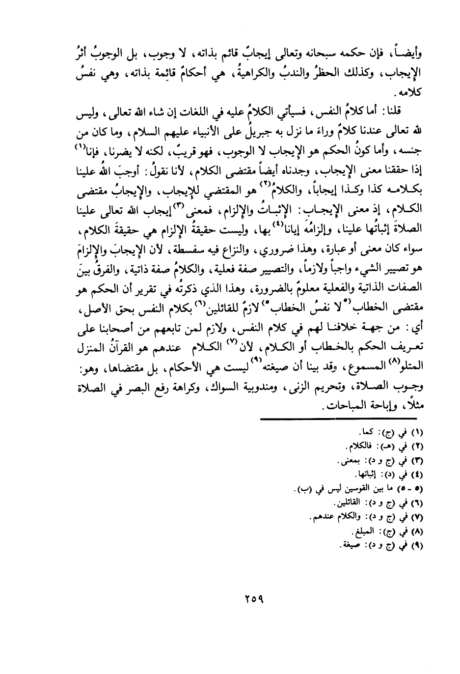 قُلْنَا: أَمَّا كَلَامُ النَّفْسِ، فَسَيَأْتِي الْكَلَامُ عَلَيْهِ فِي اللُّغَاتِ إِنْ شَاءَ اللَّهُ تَعَالَى، وَلَيْسَ لِلَّهِ تَعَالَى عِنْدَنَا كَلَامٌ وَرَاءَ مَا نَزَلْ بِهِ جِبْرِيلُ عَلَى الْأَنْبِيَاءِ - عَلَيْهِمُ السَّلَامُ -، وَمَا كَانَ مِنْ جِنْسِهِ، وَأَمَّا كَوْنُ الْحُكْمِ هُوَ الْإِيجَابُ لَا الْوُجُوبُ، فَهُوَ قَرِيبٌ، لَكِنَّهُ لَا يَضُرُّنَا، فَإِنَّا إِذَا حَقَّقْنَا مَعْنَى الْإِيجَابِ، وَجَدْنَاهُ أَيْضًا مُقْتَضَى الْكَلَامِ، لِأَنَّا نَقُولُ: أَوْجَبَ اللَّهُ عَلَيْنَا بِكَلَامِهِ كَذَا وَكَذَا إِيجَابًا، وَالْكَلَامُ هُوَ الْمُقْتَضِي لِلْإِيجَابِ، وَالْإِيجَابُ مُقْتَضَى الْكَلَامِ، إِذْ مَعْنَى الْإِيجَابِ: الْإِثْبَاتُ وَالْإِلْزَامُ، فَمَعْنَى إِيجَابِ اللَّهِ تَعَالَى عَلَيْنَا الصَّلَاةَ إِثْبَاتُهَا عَلَيْنَا، وَإِلْزَامُهُ إِيَّانَا بِهَا، وَلَيْسَتْ حَقِيقَةُ الْإِلْزَامِ هِيَ حَقِيقَةُ الْكَلَامِ، سَوَاءٌ كَانَ مَعْنًى أَوْ عِبَارَةً، وَهَذَا ضَرُورِيٌّ، وَالنِّزَاعُ فِيهِ سَفْسَطَةٌ، لِأَنَّ الْإِيجَابَ وَالْإِلْزَامَ هُوَ تَصْيِيرُ الشَّيْءِ وَاجِبًا وَلَازِمًا، وَالتَّصْيِيرُ صِفَةٌ فِعْلِيَّةٌ، وَالْكَلَامُ صِفَةٌ ذَاتِيَّةٌ، وَالْفَرْقُ بَيْنَ الصِّفَاتِ الذَّاتِيَّةِ وَالْفِعْلِيَّةِ مَعْلُومٌ بِالضَّرُورَةِ، وَهَذَا الَّذِي ذَكَرْتُهُ فِي تَقْرِيرِ أَنَّ الْحُكْمَ هُوَ مُقْتَضَى الْخِطَابِ لَا نَفْسُ الْخِطَابِ لَازِمٌ لِلْقَائِلِينَ بِكَلَامِ النَّفْسِ بِحَقِّ الْأَصْلِ، أَيْ: مِنْ جِهَةِ خِلَافِنَا لَهُمْ فِي كَلَامِ النَّفْسِ، وَلَازِمٌ لِمَنْ تَابَعَهُمْ مِنْ أَصْحَابِنَا عَلَى تَعْرِيفِ الْحُكْمِ بِالْخِطَابِ أَوِ الْكَلَامِ، لِأَنَّ الْكَلَامَ عِنْدَهُمْ هُوَ الْقُرْآنُ الْمُنَزَّلُ الْمَتْلُوُّ الْمَسْمُوعُ، وَقَدْ بَيَّنَّا أَنَّ صِيغَتَهُ لَيْسَتْ هِيَ الْأَحْكَامُ، بَلْ مُقْتَضَاهَا، وَهُوَ: وُجُوبُ الصَّلَاةِ، وَتَحْرِيمُ الزِّنَى، وَمَنْدُوبِيَّةُ السِّوَاكِ، وَكَرَاهَةُ رَفْعِ الْبَصَرِ فِي الصَّلَاةِ مَثَلًا، وَإِبَاحَةُ الْمُبَاحَاتِ.