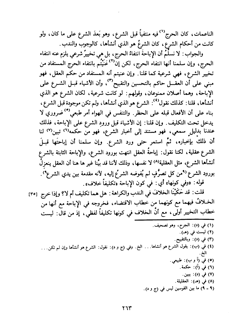 وَالْجَوَابُ: لَا نُسَلِّمُ أَنَّ الْإِبَاحَةَ انْتِفَاءُ الْحَرَجِ، بَلْ هِيَ تَخْيِيرٌ شَرْعِيٌّ يَلْزَمُ عَنْهُ انْتِفَاءُ الْحَرَجِ، وَإِنْ سَلَّمْنَا أَنَّهَا انْتِفَاءُ الْحَرَجِ، لَكِنْ إِنْ عَنَيْتُمْ بِانْتِفَاءِ الْحَرَجِ الْمُسْتَفَادَ مِنْ تَخْيِيرِ الشَّرْعِ، فَهِيَ شَرْعِيَّةٌ كَمَا قُلْنَا. وَإِنْ عَنَيْتُمْ أَنَّهُ الْمُسْتَفَادُ مِنْ حُكْمِ الْعَقْلِ، فَهُوَ مَبْنِيٌّ عَلَى أَنَّ الْعَقْلَ حَاكِمٌ بِالتَّحْسِينِ وَالتَّقْبِيحِ، وَأَنَّ الْأَشْيَاءَ قَبْلَ الشَّرْعِ عَلَى الْإِبَاحَةِ، وَهُمَا أَصْلَانِ مَمْنُوعَانِ، وَقَوْلُهُمْ: لَوْ كَانَتْ شَرْعِيَّةً، لَكَانَ هُوَ الَّذِي أَنْشَأَهَا، قُلْنَا: كَذَلِكَ نَقُولُ: الشَّرْعُ هُوَ الَّذِي أَنْشَأَهَا، وَلَمْ تَكُنْ مَوْجُودَةً قَبْلَ الشَّرْعِ، بِنَاءً عَلَى أَنَّ الْأَفْعَالَ قَبْلَهُ عَلَى الْحَظْرِ. وَالتَّنَفُّسُ فِي الْهَوَاءِ أَمْرٌ طَبْعِيٌّ ضَرُورِيٌّ لَا يَدْخُلُ تَحْتَ التَّكْلِيفِ. وَإِنْ قُلْنَا: إِنَّ الْأَشْيَاءَ قَبْلَ وُرُودِ الشَّرْعِ عَلَى الْإِبَاحَةِ، فَذَلِكَ عِنْدَنَا بِدَلِيلٍ سَمْعِيٍّ، فَهُوَ مُسْتَنِدٌ إِلَى أَخْبَارِ الشَّرْعِ، فَهُوَ مِنْ حُكْمِهِ تَبَيَّنَ لَنَا أَنَّ ذَلِكَ بِإِخْبَارِهِ، ثُمَّ اسْتَمَرَّ حَتَّى وَرَدَ الشَّرْعُ. وَإِنْ سَلَّمْنَا أَنَّ إِبَاحَتَهَا قَبْلَ الشَّرْعِ عَقْلِيَّةٌ، لَكُنَّا نَقُولُ: إِبَاحَةُ الْعَقْلِ انْتَهَتْ بِوُرُودِ الشَّرْعِ، وَالْإِبَاحَةُ الثَّابِتَةُ بِالشَّرْعِ أَنْشَأَهَا الشَّرْعُ، مِثْلُ الْعَقْلِيَّةِ لَا نَفْسُهَا، وَذَلِكَ لِأَنَّنَا قَدْ بَيَّنَّا غَيْرَ هَاهُنَا أَنَّ الْعَقْلَ يَنْعَزِلُ بِوُرُودِ الشَّرْعِ مِنْ كُلِّ تَصَرُّفٍ لَمْ يُفَوِّضْهُ الشَّرْعُ إِلَيْهِ، لِأَنَّهُ مُقَدِّمَةٌ بَيْنَ يَدَيِ الشَّرْعِ.