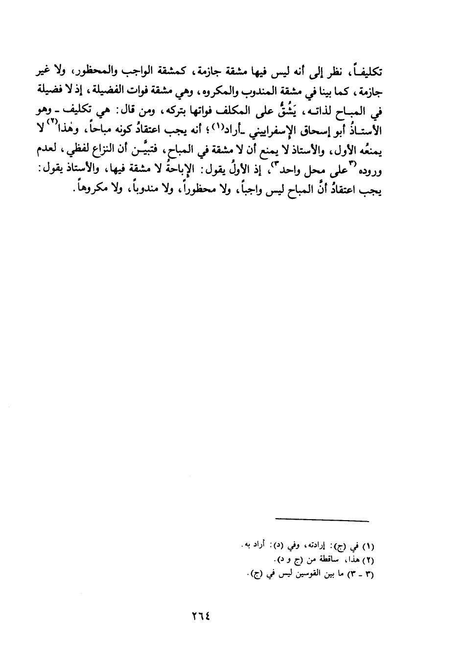 تَكْلِيفًا، نَظَرَ إِلَى أَنَّهُ لَيْسَ فِيهَا مَشَقَّةٌ جَازِمَةٌ، كَمَشَقَّةِ الْوَاجِبِ وَالْمَحْظُورِ، وَلَا غَيْرُ جَازِمَةٍ، كَمَا بَيَّنَّا فِي مَشَقَّةِ الْمَنْدُوبِ وَالْمَكْرُوهِ، وَهِيَ مَشَقَّةُ فَوَاتِ الْفَضِيلَةِ، إِذْ لَا فَضِيلَةَ فِي الْمُبَاحِ لِذَاتِهِ، يَشُقُّ عَلَى الْمُكَلَّفِ فَوَاتُهَا بِتَرْكِهِ، وَمَنْ قَالَ: هِيَ تَكْلِيفٌ - وَهُوَ الْأُسْتَاذُ أَبُو إِسْحَاقَ الْإِسْفَرَايِينِيُّ - أَرَادَ ; أَنَّهُ يَجِبُ اعْتِقَادُ كَوْنِهِ مُبَاحًا، وَهَذَا لَا يَمْنَعُهُ الْأَوَّلُ، وَالْأُسْتَاذُ لَا يَمْنَعُ أَنْ لَا مَشَقَّةَ فِي الْمُبَاحِ، فَتَبَيَّنَ أَنَّ النِّزَاعَ لَفْظِيٌّ، لِعَدَمِ وُرُودِهِ عَلَى مَحَلٍّ وَاحِدٍ، إِذِ الْأَوَّلُ يَقُولُ: الْإِبَاحَةُ لَا مَشَقَّةَ فِيهَا، وَالْأُسْتَاذُ يَقُولُ: يَجِبُ اعْتِقَادُ أَنَّ الْمُبَاحَ لَيْسَ وَاجِبًا، وَلَا مَحْظُورًا، وَلَا مَنْدُوبًا، وَلَا مَكْرُوهًا.