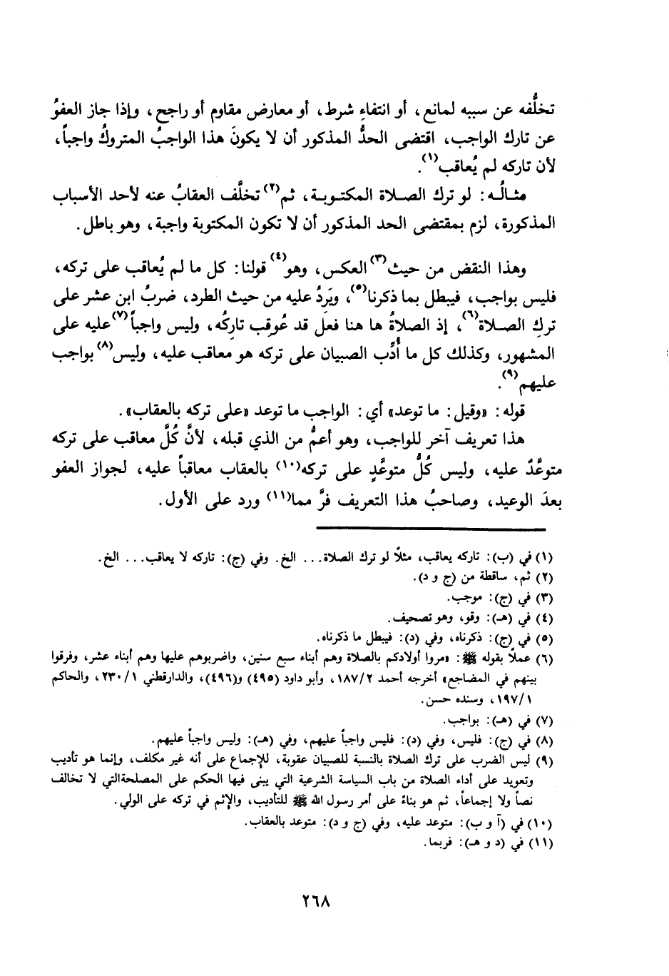 مِثَالُهُ: لَوْ تَرَكَ الصَّلَاةَ الْمَكْتُوبَةَ، ثُمَّ تَخَلَّفَ الْعِقَابُ عَنْهُ لِأَحَدِ الْأَسْبَابِ الْمَذْكُورَةِ، لَزِمَ بِمُقْتَضَى الْحَدِّ الْمَذْكُورِ أَنْ لَا تَكُونَ الْمَكْتُوبَةُ وَاجِبَةً، وَهُوَ بَاطِلٌ.