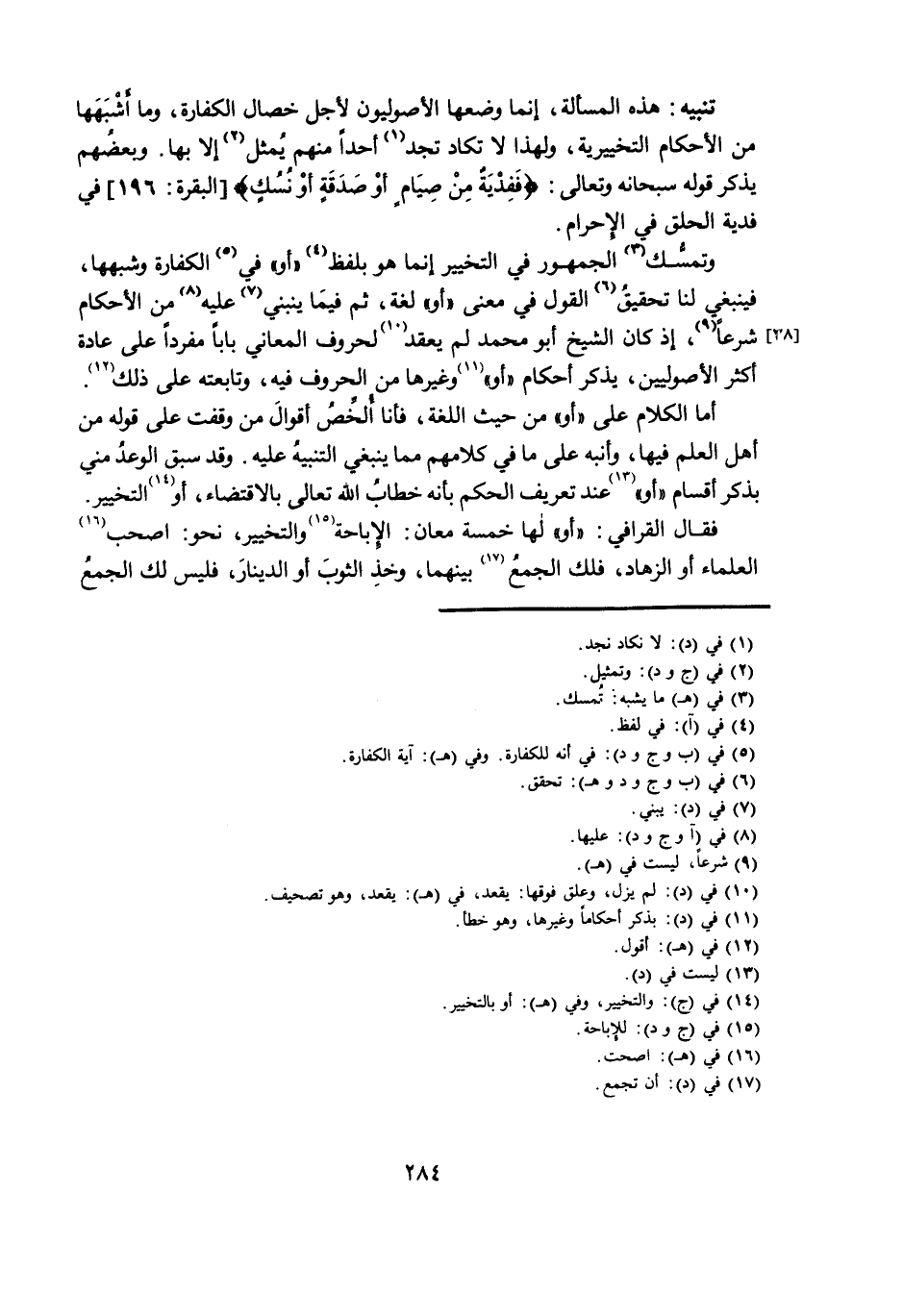 وَتَمَسُّكُ الْجُمْهُورِ فِي التَّخْيِيرِ إِنَّمَا هُوَ بِلَفْظِ «أَوْ» فِي الْكَفَّارَةِ وَشِبْهِهَا، فَيَنْبَغِي لَنَا تَحْقِيقُ الْقَوْلِ فِي مَعْنَى «أَوْ» لُغَةً، ثُمَّ فِيمَا يَنْبَنِي عَلَيْهِ مِنَ الْأَحْكَامِ شَرْعًا، إِذْ كَانَ الشَّيْخُ أَبُو مُحَمَّدٍ لَمْ يَعْقِدْ لِحُرُوفِ الْمَعَانِي بَابًا مُفْرَدًا عَلَى عَادَةِ أَكْثَرِ الْأُصُولِيِّينَ، يَذْكُرُ أَحْكَامَ «أَوْ» وَغَيْرِهَا مِنَ الْحُرُوفِ فِيهِ، وَتَابَعْتُهُ عَلَى ذَلِكَ.