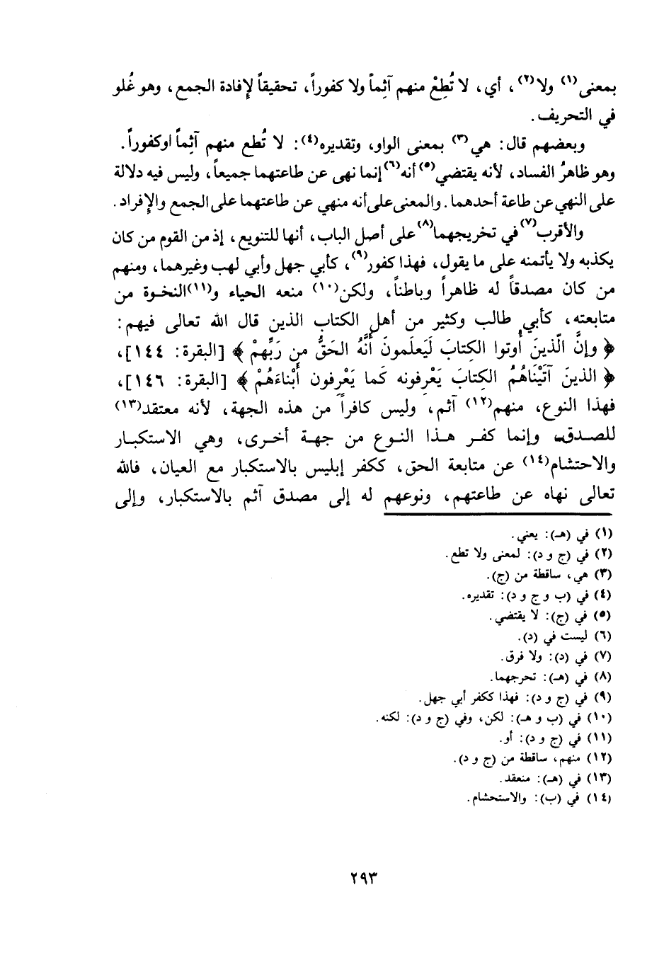 وَالْأَقْرَبُ فِي تَخْرِيجِهِمَا عَلَى أَصْلِ الْبَابِ، أَنَّهَا لِلتَّنْوِيعِ، إِذْ مِنَ الْقَوْمِ مَنْ كَانَ يُكَذِّبُهُ وَلَا يَأْتَمِنُهُ عَلَى مَا يَقُولُ، فَهَذَا كَفُورٌ، كَأَبِي جَهْلٍ وَأَبِي لَهَبٍ وَغَيْرِهِمَا، وَمِنْهُمْ مَنْ كَانَ مُصَدِّقًا لَهُ ظَاهِرًا وَبَاطِنًا، وَلَكِنْ مَنَعَهُ الْحَيَاءُ وَالنَّخْوَةُ مِنْ مُتَابَعَتِهِ، كَأَبِي طَالِبٍ وَكَثِيرٍ مِنْ أَهْلِ الْكِتَابِ الَّذِينَ قَالَ اللَّهُ تَعَالَى فِيهِمْ: {وَإِنَّ الَّذِينَ أُوتُوا الْكِتَابَ لَيَعْلَمُونَ أَنَّهُ الْحَقُّ مِنْ رَبِّهِمْ} [الْبَقَرَةِ: 144] ، {الَّذِينَ آتَيْنَاهُمُ الْكِتَابَ يَعْرِفُونَهُ كَمَا يَعْرِفُونَ أَبْنَاءَهُمْ} [الْبَقَرَةِ: 146] ، فَهَذَا النَّوْعُ، مِنْهُمْ آثِمٌ، وَلَيْسَ كَافِرًا مِنْ هَذِهِ الْجِهَةِ، لِأَنَّهُ مُعْتَقِدٌ لِلصِّدْقِ وَإِنَّمَا كُفْرُ هَذَا النَّوْعِ مِنْ جِهَةٍ أُخْرَى، وَهِيَ الِاسْتِكْبَارُ وَالِاحْتِشَامُ عَنْ مُتَابَعَةِ الْحَقِّ، كَكُفْرِ إِبْلِيسَ بِالِاسْتِكْبَارِ مَعَ الْعِيَانِ، فَاللَّهُ تَعَالَى نَهَاهُ عَنْ طَاعَتِهِمْ، وَنَوَّعَهُمْ لَهُ إِلَى مُصَدِّقٍ آثِمٍ بِالِاسْتِكْبَارِ، وَإِلَى