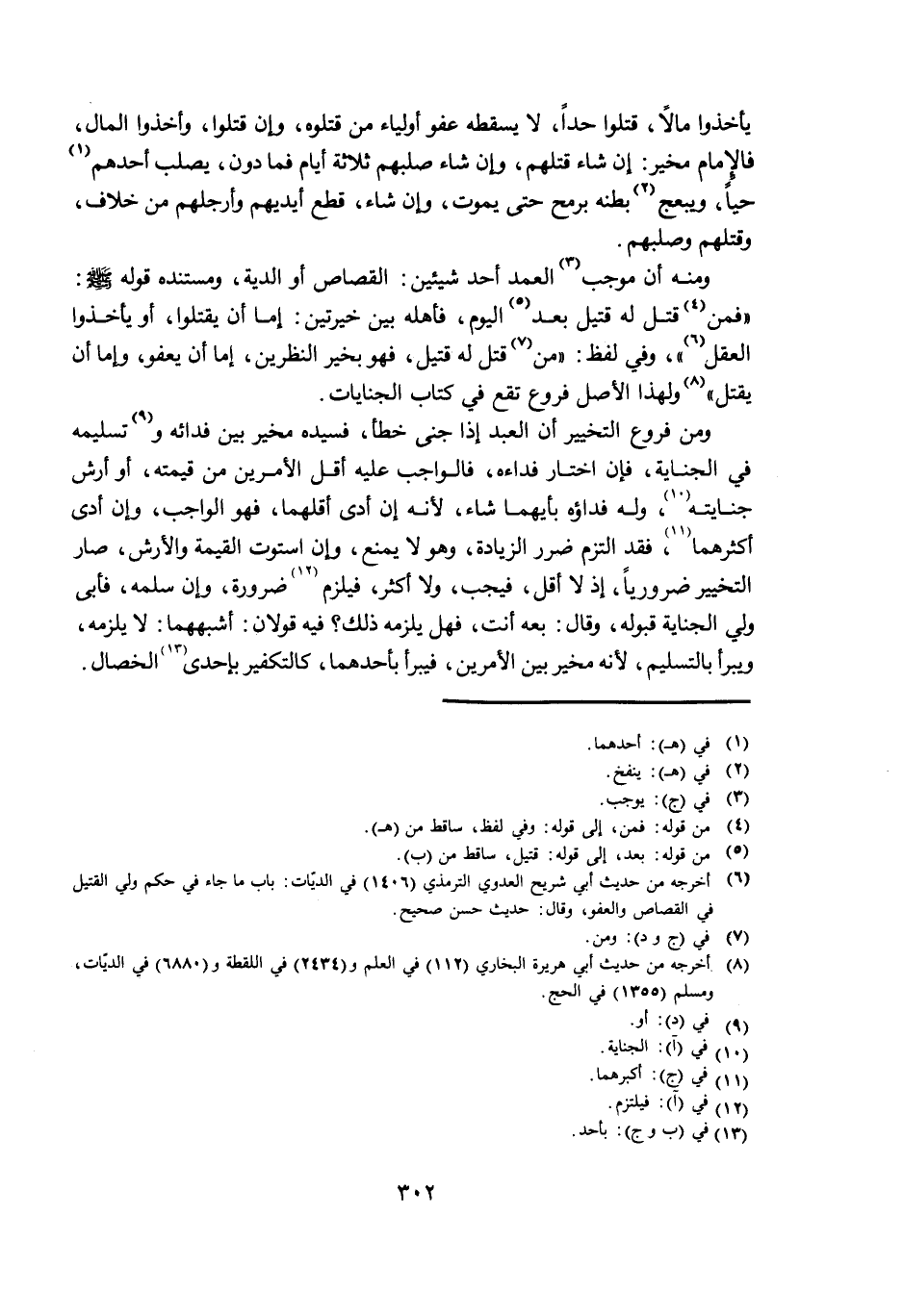 وَمِنْهُ أَنَّ مُوجِبَ الْعَمْدِ أَحَدُ شَيْئَيْنِ: الْقِصَاصُ أَوِ الدِّيَةُ، وَمُسْتَنَدُهُ قَوْلُهُ - صَلَّى اللَّهُ عَلَيْهِ وَسَلَّمَ -: فَمَنْ قُتِلَ لَهُ قَتِيلٌ بَعْدَ الْيَوْمِ، فَأَهْلُهُ بَيْنَ خِيَرَتَيْنِ: إِمَّا أَنْ يَقْتُلُوا، أَوْ يَأْخُذُوا الْعَقْلَ، وَفِي لَفْظٍ: مَنْ قُتِلَ لَهُ قَتِيلٌ، فَهُوَ بِخَيْرِ النَّظَرَيْنِ، إِمَّا أَنْ يَعْفُوَ، وَإِمَّا أَنْ يَقْتُلَ وَلِهَذَا الْأَصْلِ فُرُوعٌ تَقَعُ فِي كِتَابِ الْجِنَايَاتِ.