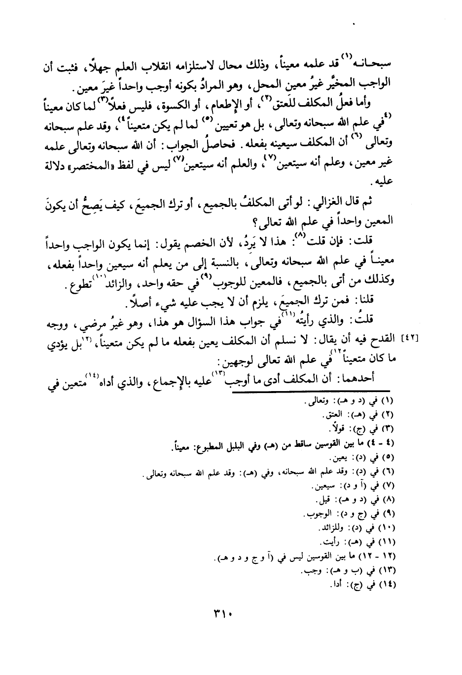 وَأَمَّا فِعْلُ الْمُكَلَّفِ لِلْعِتْقِ، أَوِ الْإِطْعَامِ، أَوِ الْكِسْوَةِ، فَلَيْسَ فِعْلًا لِمَا كَانَ مُعَيَّنًا فِي عِلْمِ اللَّهِ سُبْحَانَهُ وَتَعَالَى، بَلْ هُوَ تَعْيِينٌ لِمَا لَمْ يَكُنْ مُتَعَيِّنًا، وَقَدْ عَلِمَ سُبْحَانَهُ وَتَعَالَى أَنَّ الْمُكَلَّفَ سَيُعَيِّنُهُ بِفِعْلِهِ. فَحَاصِلُ الْجَوَابِ: أَنَّ اللَّهَ سُبْحَانَهُ وَتَعَالَى عِلْمُهُ غَيْرُ مُعَيَّنٍ، وَعَلِمَ أَنَّهُ سَيَتَعَيَّنُ، وَالْعِلْمُ أَنَّهُ سَيَتَعَيَّنُ لَيْسَ فِي لَفْظِ «الْمُخْتَصَرِ» دَلَالَةٌ عَلَيْهِ.