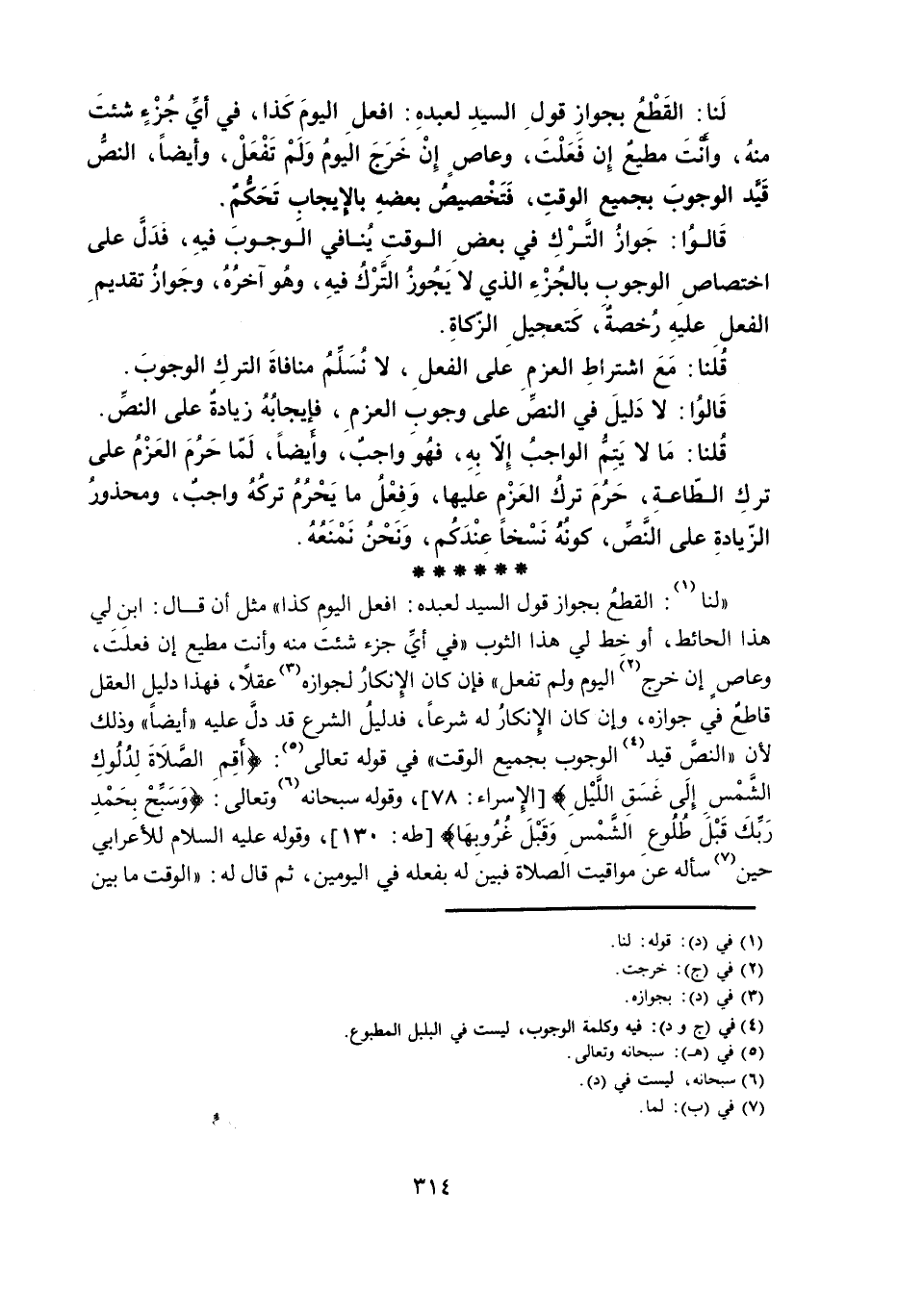 «لَنَا: الْقَطْعُ بِجَوَازِ قَوْلِ السَّيِّدِ لِعَبْدِهِ: افْعَلِ الْيَوْمَ كَذَا» مِثْلُ أَنْ قَالَ: ابْنِ لِي هَذَا الْحَائِطَ، أَوْ خِطْ لِي هَذَا الثَّوْبَ «فِي أَيِّ جُزْءٍ شِئْتَ مِنْهُ وَأَنْتَ مُطِيعٌ إِنْ فَعَلْتَ، وَعَاصٍ إِنْ خَرَجَ الْيَوْمُ وَلَمْ تَفْعَلْ» فَإِنْ كَانَ الْإِنْكَارُ لِجَوَازِهِ عَقْلًا، فَهَذَا دَلِيلُ الْعَقْلِ قَاطِعٌ فِي جَوَازِهِ، وَإِنْ كَانَ الْإِنْكَارُ لَهُ شَرْعًا، فَدَلِيلُ الشَّرْعِ قَدْ دَلَّ عَلَيْهِ «أَيْضًا» وَذَلِكَ لِأَنَّ «النَّصَّ قَيَّدَ الْوُجُوبَ بِجَمِيعِ الْوَقْتِ» فِي قَوْلِهِ تَعَالَى: {أَقِمِ الصَّلَاةَ لِدُلُوكِ الشَّمْسِ إِلَى غَسَقِ اللَّيْلِ} [الْإِسْرَاءِ: 78] ، وَقَوْلِهِ سُبْحَانَهُ وَتَعَالَى: {وَسَبِّحْ بِحَمْدِ رَبِّكَ قَبْلَ طُلُوعِ الشَّمْسِ وَقَبْلَ غُرُوبِهَا} [طه: 130] ، وَقَوْلِهِ - عَلَيْهِ السَّلَامُ - لِلْأَعْرَابِيِّ حِينَ سَأَلَهُ عَنْ مَوَاقِيتِ الصَّلَاةِ فَبَيَّنَ لَهُ بِفِعْلِهِ فِي الْيَوْمَيْنِ، ثُمَّ قَالَ لَهُ: الْوَقْتُ مَا بَيْنَ