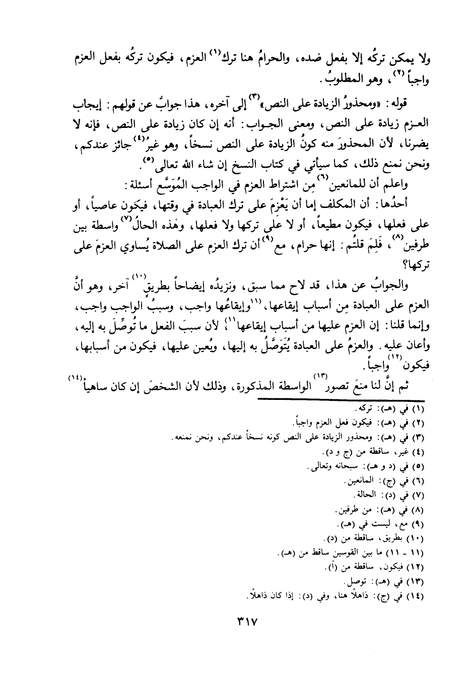 قَوْلُهُ: «وَمَحْذُورُ الزِّيَادَةِ عَلَى النَّصِّ» إِلَى آخِرِهِ، هَذَا جَوَابٌ عَنْ قَوْلِهِمْ: إِيجَابُ الْعَزْمِ زِيَادَةٌ عَلَى النَّصِّ، وَمَعْنَى الْجَوَابِ: أَنَّهُ إِنْ كَانَ زِيَادَةً عَلَى النَّصِّ، فَإِنَّهُ لَا يَضُرُّنَا، لِأَنَّ الْمَحْذُورَ مِنْهُ كَوْنُ الزِّيَادَةُ عَلَى النَّصِّ نَسْخًا، وَهُوَ غَيْرُ جَائِزٍ عِنْدَكُمْ، وَنَحْنُ نَمْنَعُ ذَلِكَ، كَمَا سَيَأْتِي فِي كِتَابِ النَّسْخِ إِنْ شَاءَ اللَّهُ تَعَالَى.