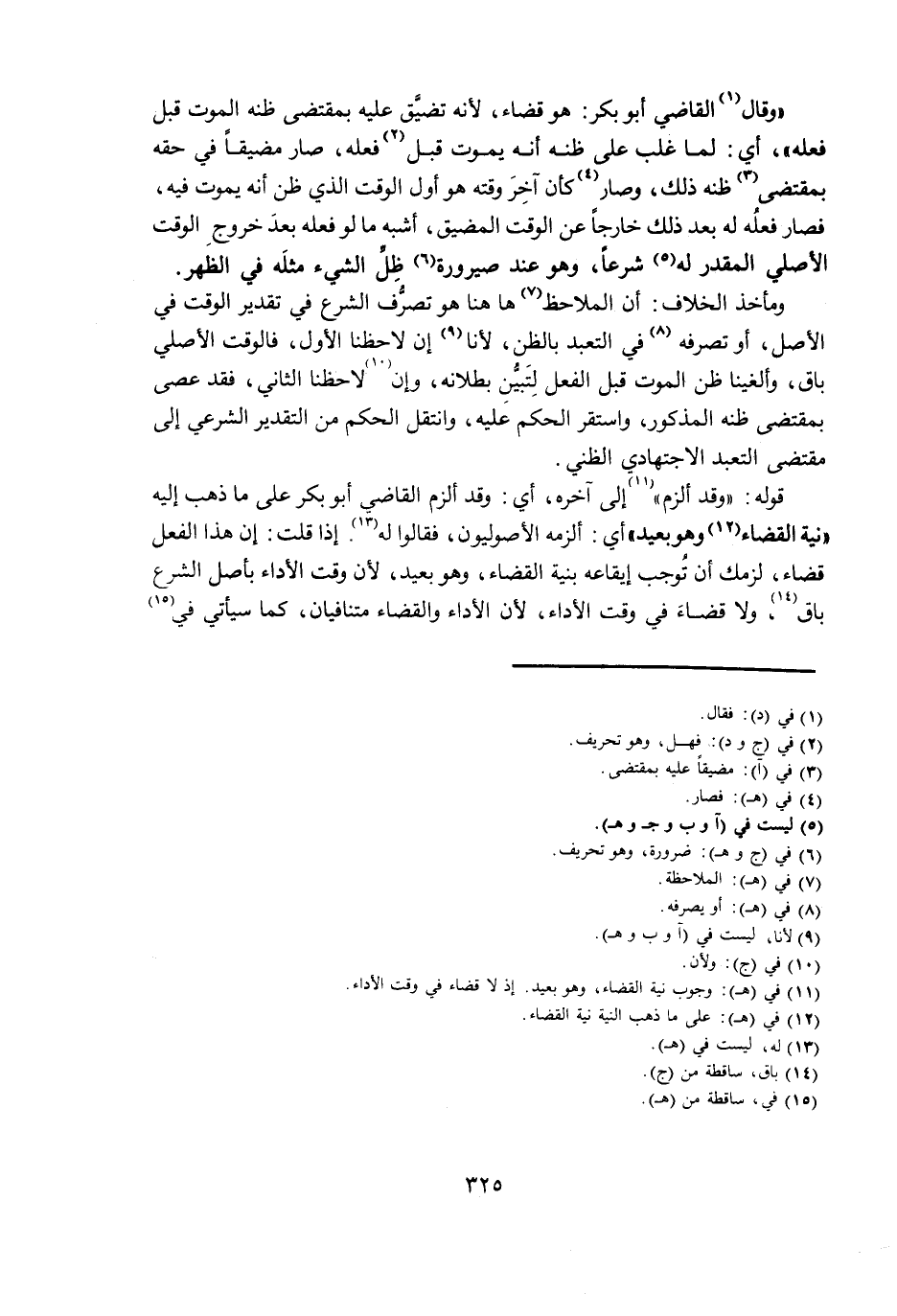 " وَقَالَ الْقَاضِي أَبُو بَكْرٍ: هُوَ قَضَاءٌ، لِأَنَّهُ تَضَيَّقَ عَلَيْهِ بِمُقْتَضَى ظَنِّهِ الْمَوْتَ قَبْلَ فِعْلِهِ "، أَيْ: لَمَّا غَلَبَ عَلَى ظَنِّهِ أَنَّهُ يَمُوتُ قَبْلَ فِعْلِهِ، صَارَ مُضَيَّقًا فِي حَقِّهِ بِمُقْتَضَى ظَنِّهِ ذَلِكَ، وَصَارَ كَأَنَّ آخِرَ وَقْتِهِ هُوَ أَوَّلُ الْوَقْتِ الَّذِي ظَنَّ أَنَّهُ يَمُوتُ فِيهِ، فَصَارَ فِعْلُهُ لَهُ بَعْدَ ذَلِكَ خَارِجًا عَنِ الْوَقْتِ الْمُضَيَّقِ، أَشْبَهَ مَا لَوْ فَعَلَهُ بَعْدَ خُرُوجِ الْوَقْتِ الْأَصْلِيِّ الْمُقَدَّرِ لَهُ شَرْعًا، وَهُوَ عِنْدَ صَيْرُورَةِ ظِلِّ الشَّيْءِ مِثْلَهُ فِي الظُّهْرِ.