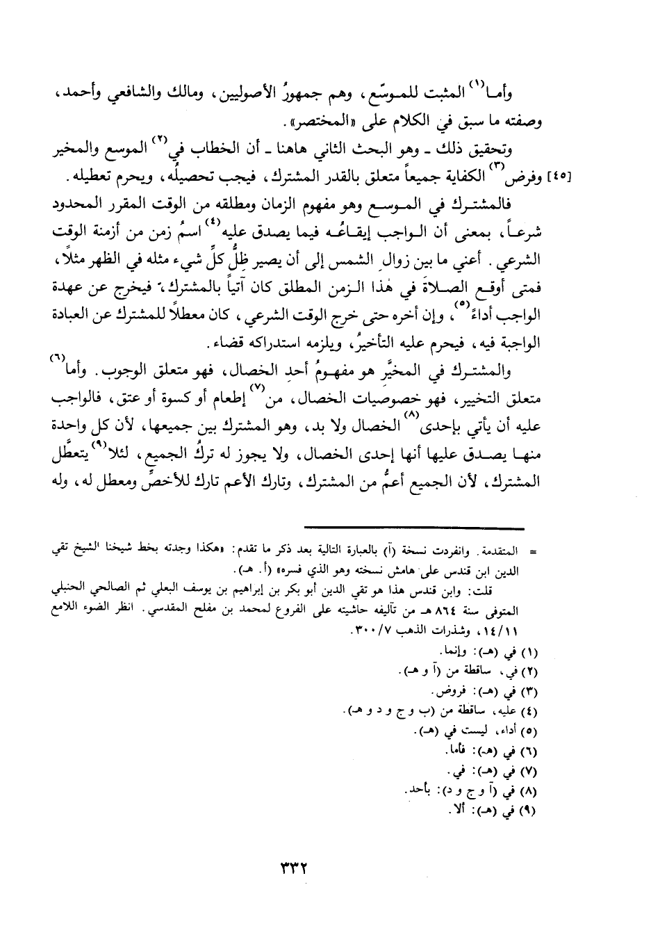فَالْمُشْتَرَكُ فِي الْمُوَسَّعِ وَهُوَ مَفْهُومُ الزَّمَانِ وَمُطْلَقُهُ مِنَ الْوَقْتِ الْمُقَرَّرِ الْمَحْدُودِ شَرْعًا، بِمَعْنَى أَنَّ الْوَاجِبَ إِيقَاعُهُ فِيمَا يَصْدُقُ عَلَيْهِ اسْمُ زَمَنٍ مِنْ أَزْمِنَةِ الْوَقْتِ الشَّرْعِيِّ. أَعْنِي مَا بَيْنَ زَوَالِ الشَّمْسِ إِلَى أَنَّ يَصِيرَ ظِلُّ كُلِّ شَيْءٍ مِثْلَهُ فِي الظُّهْرِ مَثَلًا، فَمَتَى أَوْقَعَ الصَّلَاةَ فِي هَذَا الزَّمَنِ الْمُطْلَقِ كَانَ آتِيًا بِالْمُشْتَرَكِ، فَيَخْرُجُ عَنْ عُهْدَةِ الْوَاجِبِ أَدَاءً، وَإِنْ أَخَّرَهُ حَتَّى خَرَجَ الْوَقْتُ الشَّرْعِيُّ، كَانَ مُعَطَّلًا لِلْمُشْتَرَكِ عَنِ الْعِبَادَةِ الْوَاجِبَةِ فِيهِ، فَيَحْرُمُ عَلَيْهِ التَّأْخِيرُ، وَيَلْزَمُهُ اسْتِدْرَاكُهُ قَضَاءً.