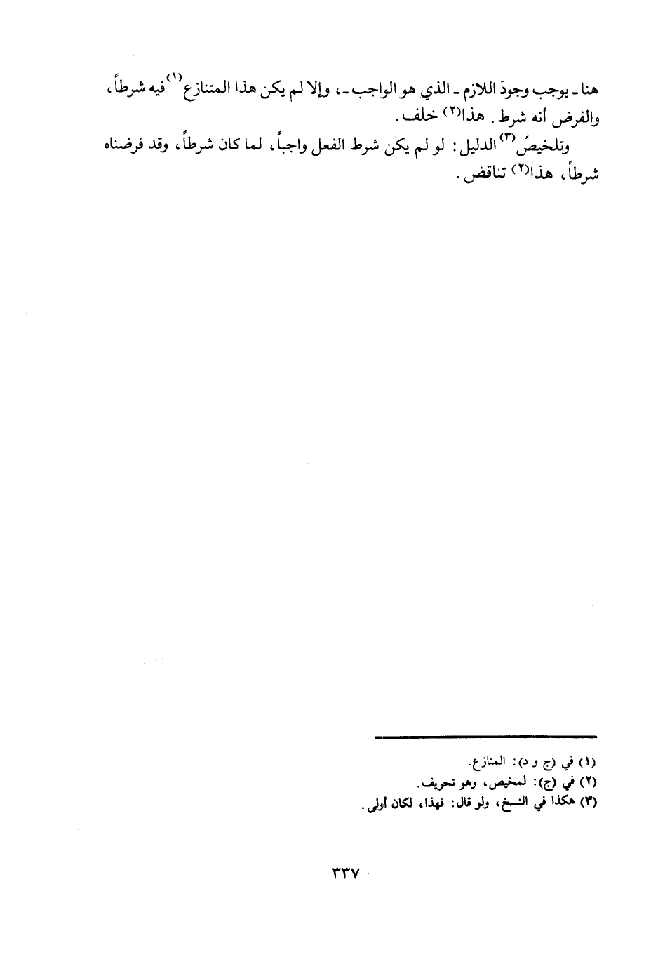 هُنَا - يُوجِبُ وُجُودَ اللَّازِمِ - الَّذِي هُوَ الْوَاجِبُ -، وَإِلَّا لَمْ يَكُنْ هَذَا الْمُتَنَازَعُ فِيهِ شَرْطًا، وَالْفَرْضُ أَنَّهُ شَرْطٌ. هَذَا خُلْفٌ.