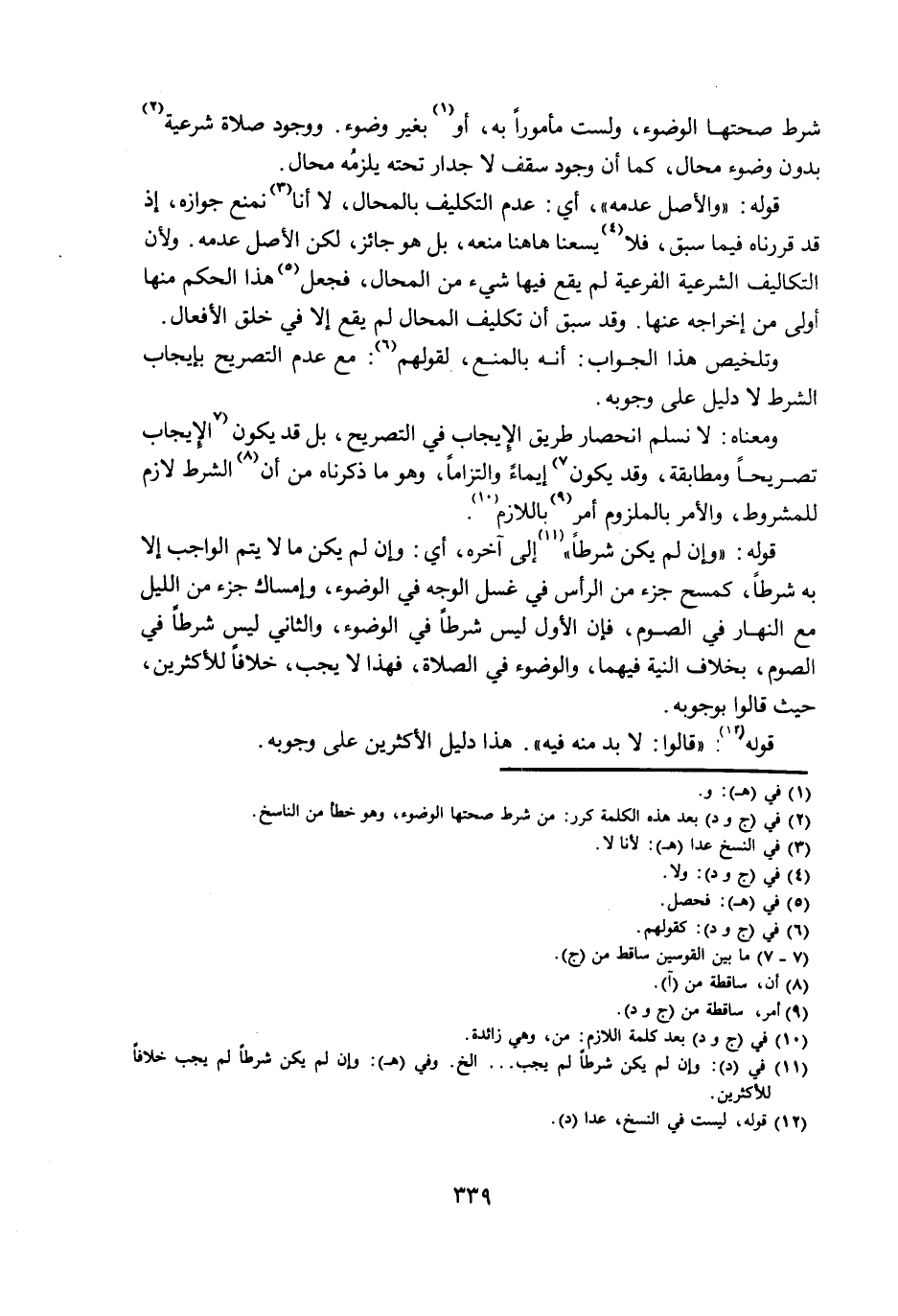 شَرْطِ صِحَّتِهَا الْوُضُوءُ، وَلَسْتَ مَأْمُورًا بِهِ، أَوْ بِغَيْرِ وُضُوءٍ. وَوُجُودُ صَلَاةٍ شَرْعِيَّةٍ بِدُونِ وُضُوءٍ مُحَالٌ، كَمَا أَنَّ وُجُودَ سَقْفٍ لَا جِدَارَ تَحْتَهُ يَلْزَمُهُ مُحَالٌ.