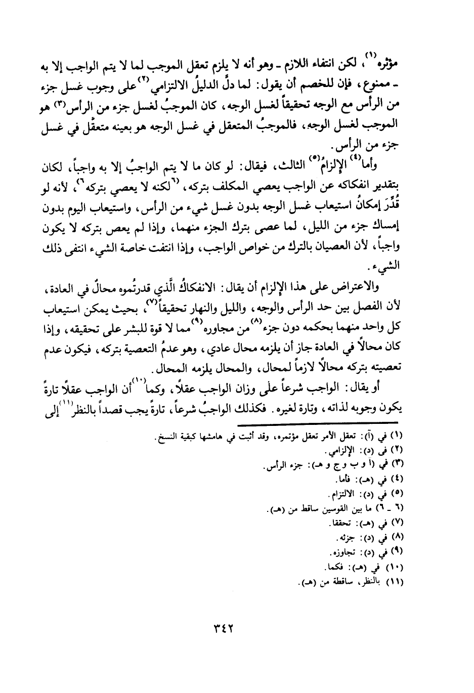 وَالِاعْتِرَاضُ عَلَى هَذَا الْإِلْزَامِ أَنْ يُقَالَ: الِانْفِكَاكُ الَّذِي قَدَّرْتُمُوهُ مُحَالٌ فِي الْعَادَةِ، لِأَنَّ الْفَصْلَ بَيْنَ حَدِّ الرَّأْسِ وَالْوَجْهِ، وَاللَّيْلِ وَالنَّهَارِ تَحْقِيقًا، بِحَيْثُ يُمْكِنُ اسْتِيعَابُ كُلِّ وَاحِدٍ مِنْهَا بِحُكْمِهِ دُونَ جُزْءٍ مِنْ مُجَاوَرِهِ مِمَّا لَا قُوَّةَ لِلْبَشَرِ عَلَى تَحْقِيقِهِ، وَإِذَا كَانَ مُحَالًا فِي الْعَادَةِ جَازَ أَنْ يَلْزَمَهُ مُحَالٌ عَادِيٌّ، وَهُوَ عَدَمُ التَّعْصِيَةِ بِتَرْكِهِ، فَيَكُونُ عَدَمُ تَعْصِيَتِهِ بِتَرْكِهِ مُحَالًا لَازِمًا لِمُحَالٍ، وَالْمُحَالُ يَلْزَمُهُ الْمُحَالُ.
