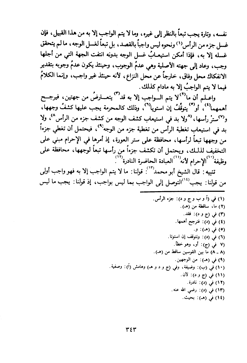وَاعْلَمْ أَنَّ مَا لَا يَتِمُّ الْوَاجِبُ إِلَّا بِهِ قَدْ يَتَعَارَضُ مِنْ جِهَتَيْنِ، فَيُرَجِّحُ أَهَمَّهُمَا، أَوْ يَتَوَقَّفُ إِنِ اسْتَوَيَا، وَذَلِكَ كَالْمُحْرِمَةِ يَجِبُ عَلَيْهَا كَشْفُ وَجْهِهَا، وَسَتْرُ رَأْسِهَا، وَلَابُدَّ فِي اسْتِيعَابِ كَشْفِ الْوَجْهِ مِنْ كَشْفِ جُزْءٍ مِنَ الرَّأْسِ، وَلَابُدَّ فِي اسْتِيعَابِ تَغْطِيَةِ الرَّأْسِ، مِنْ تَغْطِيَةِ جُزْءٍ مِنَ الْوَجْهِ، فَيُحْتَمَلُ أَنْ تُغَطِّيَ جُزْءًا مِنْ وَجْهِهَا تَبَعًا لِرَأْسِهَا، مُحَافَظَةً عَلَى سَتْرِ الْعَوْرَةِ، إِذْ أَمْرُهَا فِي الْإِحْرَامِ مَبْنِيٌّ عَلَى التَّخْفِيفِ لِذَلِكَ، وَيُحْتَمَلُ أَنْ تَكْشِفَ جُزْءًا مِنْ رَأْسِهَا تَبَعًا لِوَجْهِهَا، مُحَافَظَةً عَلَى وَظِيفَةِ الْإِحْرَامِ لِأَنَّهُ الْعِبَادَةُ الْحَاضِرَةُ النَّادِرَةُ.