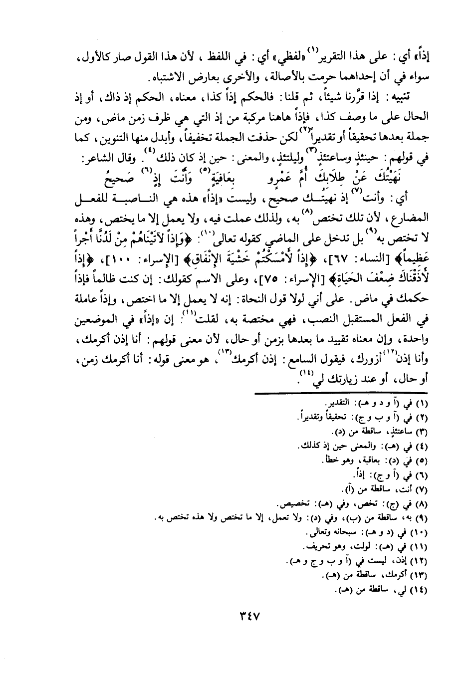 تَنْبِيهٌ: إِذَا قَرَّرْنَا شَيْئًا، ثُمَّ قُلْنَا: فَالْحُكْمُ إِذًا كَذَا، مَعْنَاهُ، الْحُكْمُ إِذْ ذَاكَ، أَوْ إِذِ الْحَالُ عَلَى مَا وَصَفَ كَذَا، فَإِذًا هَاهُنَا مُرَكَّبَةٌ مِنْ إِذِ الَّتِي هِيَ ظَرْفُ زَمَنٍ مَاضٍ، وَمِنْ جُمْلَةٍ بَعْدَهَا تَحْقِيقًا أَوْ تَقْدِيرًا لَكِنْ حُذِفَتِ الْجُمْلَةُ تَخْفِيفًا، وَأُبْدِلَ مِنْهَا التَّنْوِينُ، كَمَا فِي قَوْلِهِمْ: حِينَئِذٍ وَسَاعَتَئِذٍ وَلَيْلَتَئِذٍ، وَالْمَعْنَى: حِينَ إِذْ كَانَ ذَلِكَ. وَقَالَ الشَّاعِرُ:
