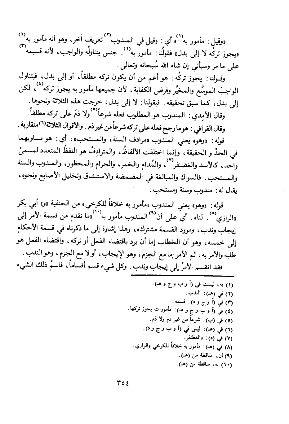 قَوْلُهُ: «وَهُوَ» يَعْنِي الْمَنْدُوبَ «مَأْمُورٌ بِهِ خِلَافًا لِلْكَرْخِيِّ» مِنَ الْحَنَفِيَّةِ «وَ» أَبِي بَكْرٍ «الرَّازِيِّ. لَنَا» أَيْ عَلَى أَنَّ الْمَنْدُوبَ مَأْمُورٌ بِهِ «مَا تَقَدَّمَ مِنْ قِسْمَةِ الْأَمْرِ إِلَى إِيجَابٍ وَنَدْبٍ، وَمَوْرِدُ الْقِسْمَةِ مُشْتَرَكٌ» ، وَهَذَا إِشَارَةٌ إِلَى مَا ذَكَرْنَاهُ فِي قِسْمَةِ الْأَحْكَامِ إِلَى خَمْسَةٍ، وَهُوَ أَنَّ الْخِطَابَ إِمَّا أَنْ يَرِدَ بِاقْتِضَاءِ الْفِعْلِ أَوْ تَرْكِهِ، وَاقْتِضَاءُ الْفِعْلِ هُوَ طَلَبُهُ وَالْأَمْرُ بِهِ، ثُمَّ الْأَمْرُ إِمَّا مَعَ الْجَزْمِ، وَهُوَ الْإِيجَابُ، أَوْ لَا مَعَ الْجَزْمِ، وَهُوَ النَّدْبُ.