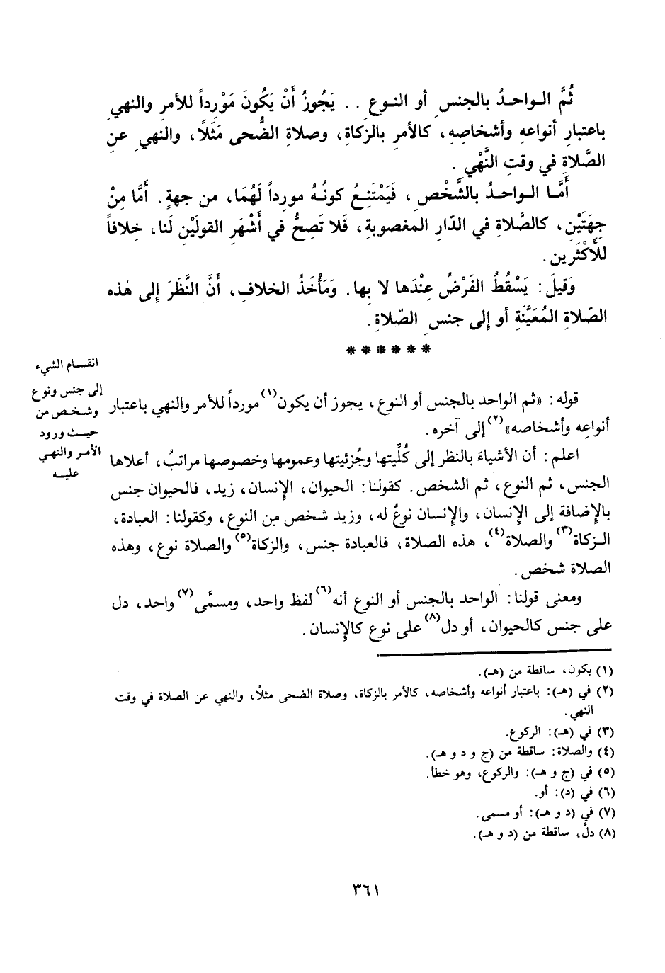 اعْلَمْ: أَنَّ الْأَشْيَاءَ بِالنَّظَرِ إِلَى كُلِّيَّتِهَا وَجُزْئِيَّتِهَا وَعُمُومِهَا وَخُصُوصِهَا مَرَاتِبُ، أَعْلَاهَا الْجِنْسُ، ثُمَّ النَّوْعُ، ثُمَّ الشَّخْصُ. كَقَوْلِنَا: الْحَيَوَانُ، الْإِنْسَانُ، زَيْدٌ، فَالْحَيَوَانُ جِنْسٌ بِالْإِضَافَةِ إِلَى الْإِنْسَانِ، وَالْإِنْسَانُ نَوْعٌ لَهُ، وَزَيْدٌ شَخْصٌ مِنَ النَّوْعِ، وَكَقَوْلِنَا: الْعِبَادَةُ، الزَّكَاةُ وَالصَّلَاةُ، هَذِهِ الصَّلَاةُ، فَالْعِبَادَةُ جِنْسٌ، وَالزَّكَاةُ وَالصَّلَاةُ نَوْعٌ، وَهَذِهِ الصَّلَاةُ شَخْصٌ.