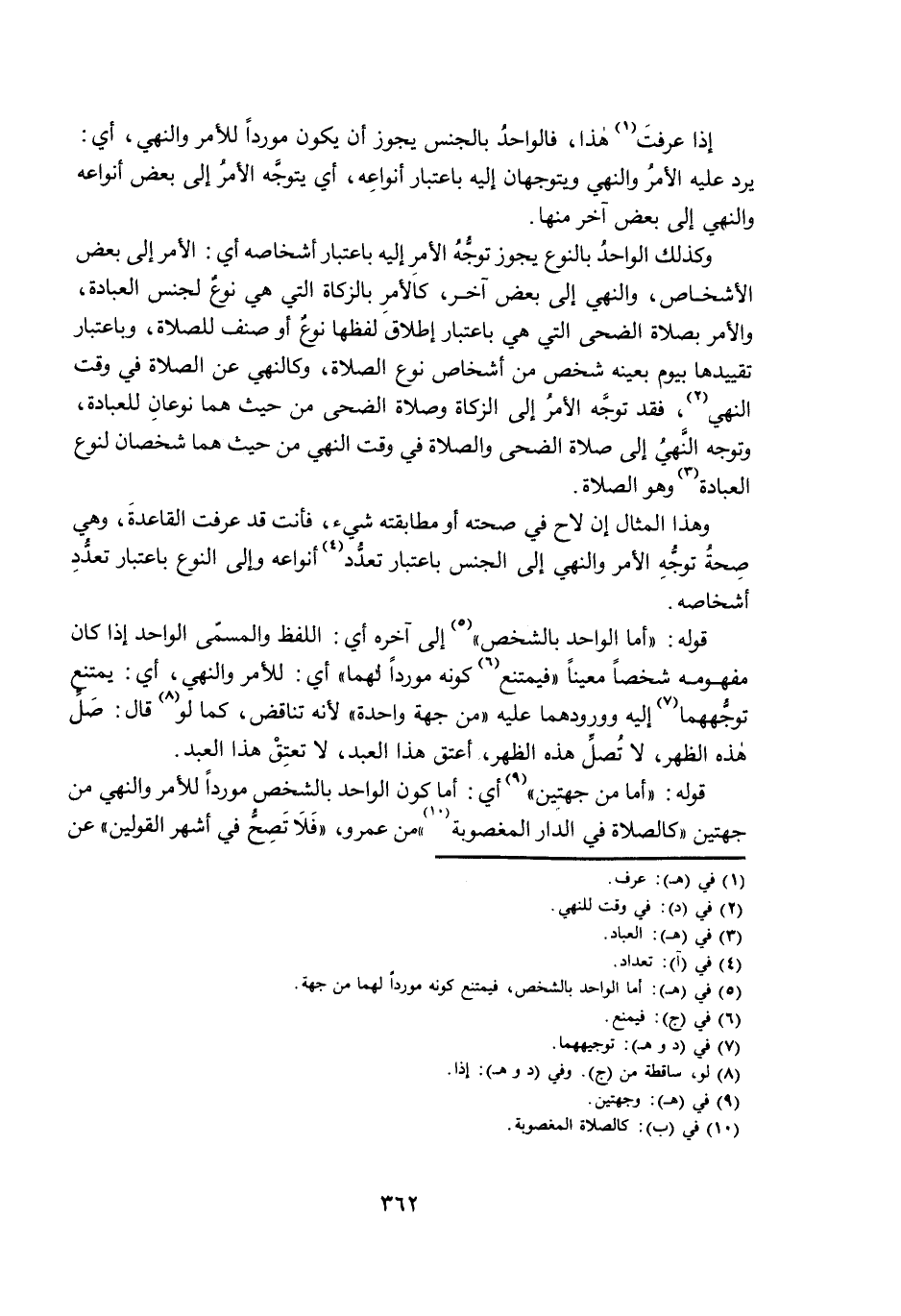 وَكَذَلِكَ الْوَاحِدُ بِالنَّوْعِ يَجُوزُ تَوَجُّهُ الْأَمْرِ إِلَيْهِ بِاعْتِبَارِ أَشْخَاصِهِ أَيِ: الْأَمْرُ إِلَى بَعْضِ الْأَشْخَاصِ، وَالنَّهْيُ إِلَى بَعْضٍ آخَرَ، كَالْأَمْرِ بِالزَّكَاةِ الَّتِي هِيَ نَوْعٌ لِجِنْسِ الْعِبَادَةِ، وَالْأَمْرُ بِصَلَاةِ الضُّحَى الَّتِي هِيَ بِاعْتِبَارِ إِطْلَاقِ نَوْعٍ أَوْ صِنْفٍ لِلصَّلَاةِ، وَبِاعْتِبَارِ تَقْيِيدِهَا بِيَوْمٍ بِعَيْنِهِ شَخْصٌ مِنْ أَشْخَاصِ نَوْعِ الصَّلَاةِ، وَكَالنَّهْيِ عَنِ الصَّلَاةِ فِي وَقْتِ النَّهْيِ، فَقَدْ تَوَجَّهَ الْأَمْرُ إِلَى الزَّكَاةِ وَصَلَاةِ الضُّحَى مِنْ حَيْثُ هُمَا نَوْعَانِ لِلْعِبَادَةِ، وَتَوَجَّهَ النَّهْيُ إِلَى صَلَاةِ الضُّحَى وَالصَّلَاةِ فِي وَقْتِ النَّهْيِ مِنْ حَيْثُ هُمَا شَخْصَانِ لِنَوْعِ الْعِبَادَةِ وَهُوَ الصَّلَاةُ.