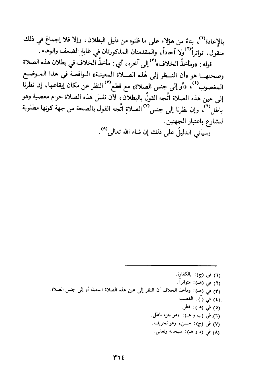 بِالْإِعَادَةِ، بِنَاءً مِنْ هَؤُلَاءِ عَلَى مَا ظَنُّوهُ مِنْ دَلِيلِ الْبُطْلَانِ، وَإِلَّا فَلَا إِجْمَاعَ فِي ذَلِكَ مَنْقُولٌ، تَوَاتُرًا وَلَا آحَادًا، وَالْمُقَدِّمَتَانِ الْمَذْكُورَتَانِ فِي غَايَةِ الضَّعْفِ وَالْوَهَاَءِ.