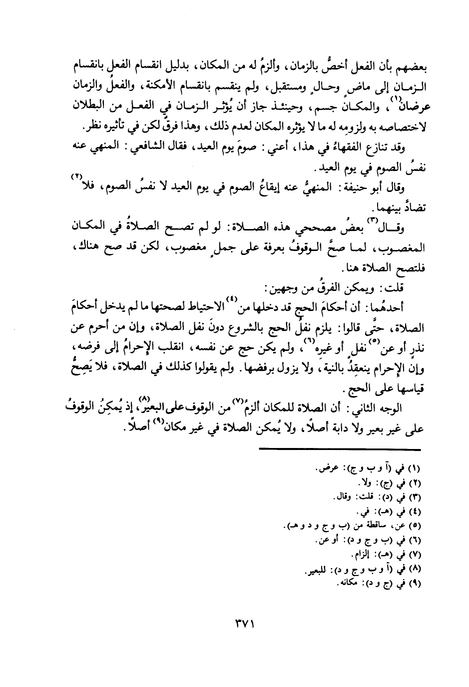 بَعْضُهُمْ بِأَنَّ الْفِعْلَ أَخَصُّ بِالزَّمَانِ، وَأَلْزَمُ لَهُ مِنَ الْمَكَانِ بِدَلِيلِ انْقِسَامِ الْفِعْلِ بِانْقِسَامِ الزَّمَانِ إِلَى مَاضٍ وَحَالٍ وَمُسْتَقْبَلٍ، وَلَمْ يَنْقَسِمْ بِانْقِسَامِ الْأَمْكِنَةِ، وَالْفِعْلُ وَالزَّمَانُ عَرَضَانِ وَالْمَكَانُ جِسْمٌ، وَحِينَئِذٍ جَازَ أَنْ يُؤَثِّرَ الزَّمَانُ فِي الْفِعْلِ مِنَ الْبُطْلَانِ لِاخْتِصَاصِهِ بِهِ وَلُزُومِهِ مَا لَا يُؤْثِرُهُ الْمَكَانُ لِعَدَمِ ذَلِكَ، وَهَذَا فَرْقٌ لَكِنْ فِي تَأْثِيرِهِ نَظَرٌ. وَقَدْ تَنَازَعَ الْفُقَهَاءُ فِي هَذَا أَعْنِي: صَوْمَ يَوْمِ الْعِيدِ، فَقَالَ الشَّافِعِيُّ: الْمَنْهِيُّ عَنْهُ نَفْسُ الصَّوْمِ فِي يَوْمِ الْعِيدِ.