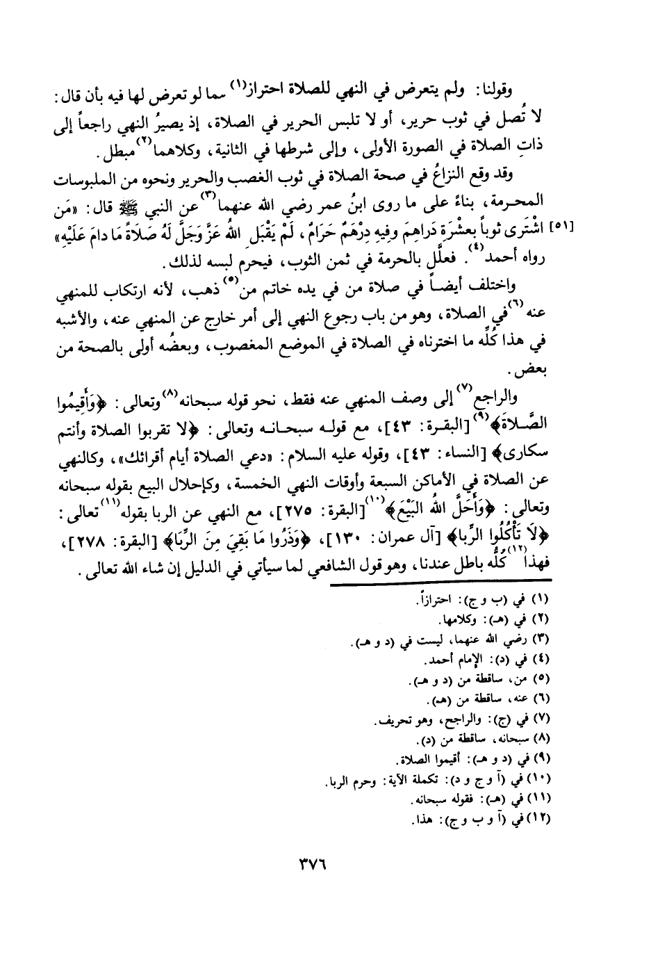 وَقَوْلُنَا: وَلَمْ يَتَعَرَّضْ فِي النَّهْيِ لِلصَّلَاةِ احْتِرَازٌ مِمَّا لَوْ تَعَرَّضَ لَهَا فِيهِ بِأَنْ قَالَ: لَا تُصَلِّ فِي ثَوْبٍ حَرِيرٍ، أَوْ لَا تَلْبَسِ الْحَرِيرَ فِي الصَّلَاةِ، إِذْ يَصِيرُ النَّهْيُ رَاجِعًا إِلَى ذَاتِ الصَّلَاةِ فِي الصُّورَةِ الْأُولَى، وَإِلَى شَرْطِهَا فِي الثَّانِيَةِ، وَكِلَاهُمَا مُبْطِلٌ.