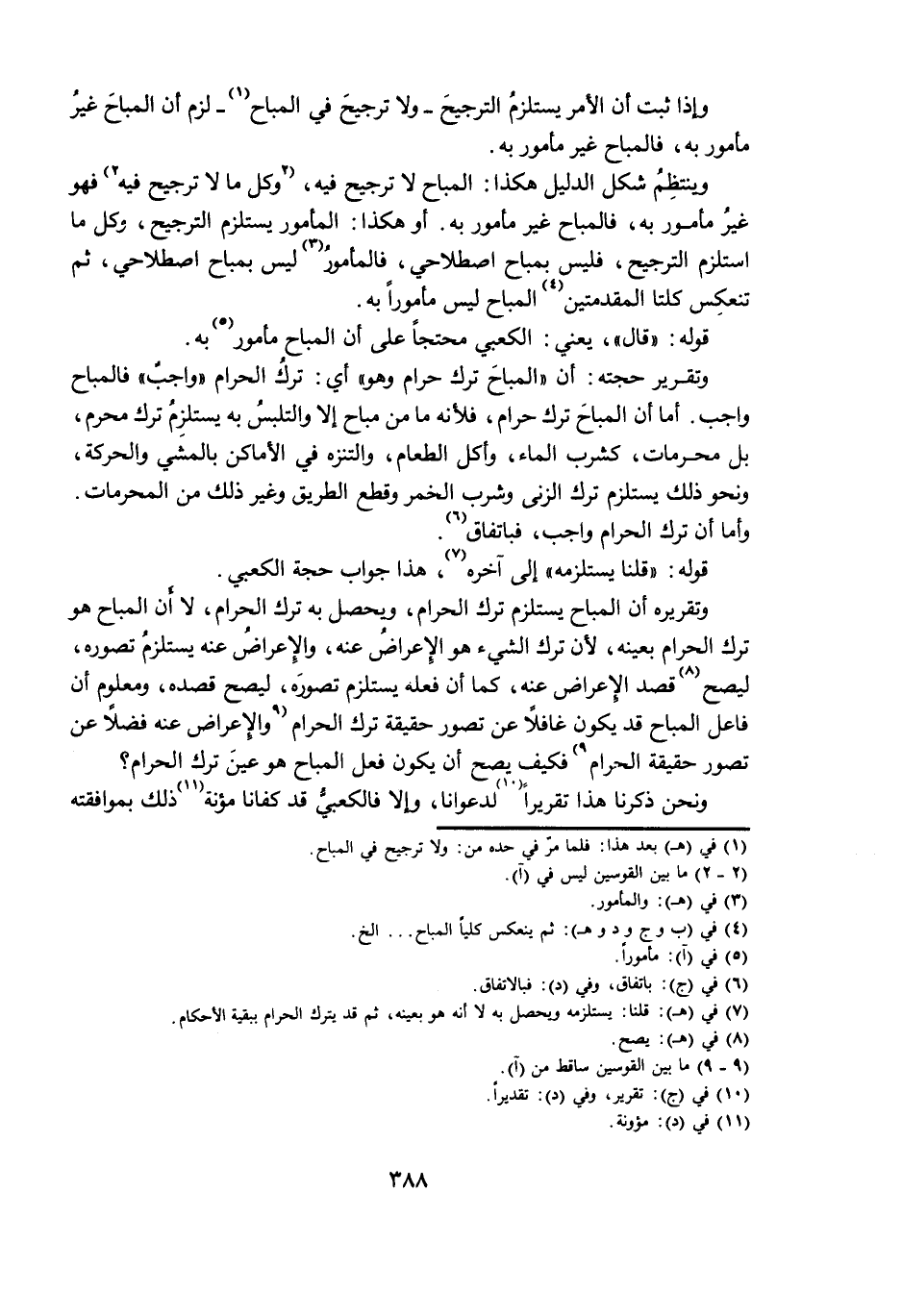 وَتَقْرِيرُ حُجَّتِهِ: أَنَّ الْمُبَاحَ تَرْكُ حَرَامٍ وَهُوَ " أَيْ: تَرْكُ الْحَرَامِ " وَاجِبٌ " فَالْمُبَاحُ وَاجِبٌ. أَمَّا أَنَّ الْمُبَاحَ تَرْكُ حَرَامٍ، فَلِأَنَّهُ مَا مِنْ مُبَاحٍ إِلَّا وَالتَّلَبُّسُ بِهِ يَسْتَلْزِمُ تَرْكَ مُحَرَّمٍ، بَلْ مُحَرَّمَاتٍ، كَشُرْبِ الْمَاءِ، وَأَكْلِ الطَّعَامِ، وَالتَّنَزُّهِ فِي الْأَمَاكِنِ بِالْمَشْيِ وَالْحَرَكَةِ، وَنَحْوِ ذَلِكَ يَسْتَلْزِمُ تَرْكَ الزِّنَى وَشُرْبَ الْخَمْرِ وَقَطْعَ الطَّرِيقِ وَغَيْرَ ذَلِكَ مِنَ الْمُحَرَّمَاتِ. وَأَمَّا أَنَّ تَرْكَ الْحَرَامِ وَاجِبٌ، فَبِاتِّفَاقٍ.