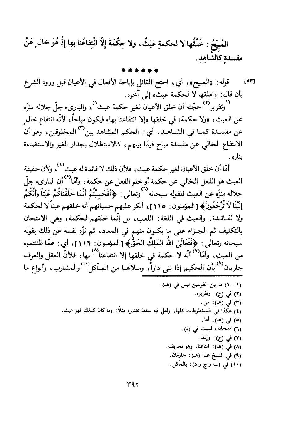 أَمَّا أَنَّ خَلْقَ الْأَعْيَانِ لِغَيْرِ حِكْمَةٍ عَبَثٌ، فَلِأَنَّ ذَلِكَ لَا فَائِدَةَ لَهُ عَبَثٌ، وَلِأَنَّ حَقِيقَةَ الْعَبَثِ هُوَ الْفِعْلُ الْخَالِي عَنْ حِكْمَةٍ أَوْ خُلُوِّ الْفِعْلِ عَنْ حِكْمَةٍ، وَأَمَّا أَنَّ الْبَارِئَ جَلَّ جَلَالُهُ مُنَزَّهٌ عَنِ الْعَبَثِ فَلِقَوْلِهِ سُبْحَانَهُ وَتَعَالَى: {أَفَحَسِبْتُمْ أَنَّمَا خَلَقْنَاكُمْ عَبَثًا وَأَنَّكُمْ إِلَيْنَا لَا تُرْجَعُونَ} [الْمُؤْمِنُونَ: 115] ، أَنْكَرَ عَلَيْهِمْ حُسْبَانَهُمْ أَنَّهُ خَلَقَهُمْ عَبَثًا لَا لِحِكْمَةٍ وَلَا لِفَائِدَةٍ، وَالْعَبَثُ فِي اللُّغَةِ: اللَّعِبُ، بَلْ إِنَّمَا خَلَقَهُمْ لِحِكْمَةٍ، وَهِيَ الِامْتِحَانُ بِالتَّكْلِيفِ ثُمَّ الْجَزَاءُ عَلَى مَا يَكُونُ مِنْهُمْ فِي الْمَعَادِ، ثُمَّ نَزَّهَ نَفْسَهُ عَنْ ذَلِكَ بِقَوْلِهِ سُبْحَانَهُ وَتَعَالَى: {فَتَعَالَى اللَّهُ الْمَلِكُ الْحَقُّ} [الْمُؤْمِنُونَ: 116] ، أَيْ: عَمَّا ظَنَنْتُمُوهُ مِنَ الْعَبَثِ، وَأَمَّا أَنَّهُ لَا حِكْمَةَ فِي خَلْقِهَا إِلَّا انْتِفَاعُنَا بِهَا، فَلِأَنَّ الْعَقْلَ وَالْعُرْفَ جَارِيَانِ بِأَنَّ الْحَكِيمَ إِذَا بَنَى دَارًا، وَمَلَأَهَا مِنَ الْمَآكِلِ وَالْمَشَارِبِ، وَأَنْوَاعِ مَا