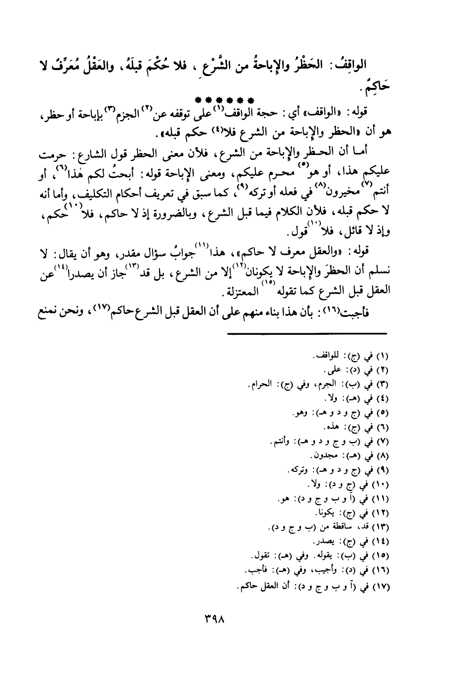 قَوْلُهُ: «الْوَاقِفُ» أَيْ: حُجَّةُ الْوَاقِفِ عَلَى تَوَقُّفِهِ عَنِ الْجَزْمِ بِإِبَاحَةٍ أَوْ حَظْرٍ، هُوَ أَنَّ «الْحَظْرَ وَالْإِبَاحَةَ مِنَ الشَّرْعِ فَلَا حُكْمَ قَبْلَهُ» .