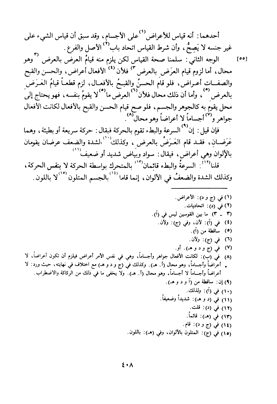فَإِنْ قِيلَ: إِنَّ السُّرْعَةَ وَالْبُطْءَ تَقُومُ بِالْحَرَكَةِ فَيُقَالُ: حَرَكَةٌ سَرِيعَةٌ أَوْ بَطِيئَةٌ، وَهُمَا عَرَضَانِ، فَقَدْ قَامَ الْعَرَضُ بِالْعَرَضِ، وَكَذَلِكَ الشِّدَّةُ وَالضَّعْفُ عَرَضَانِ يَقُومَانِ بِالْأَلْوَانِ وَهِيَ أَعْرَاضٌ، فَيُقَالُ: سَوَادٌ وَبَيَاضٌ شَدِيدٌ أَوْ ضَعِيفٌ.