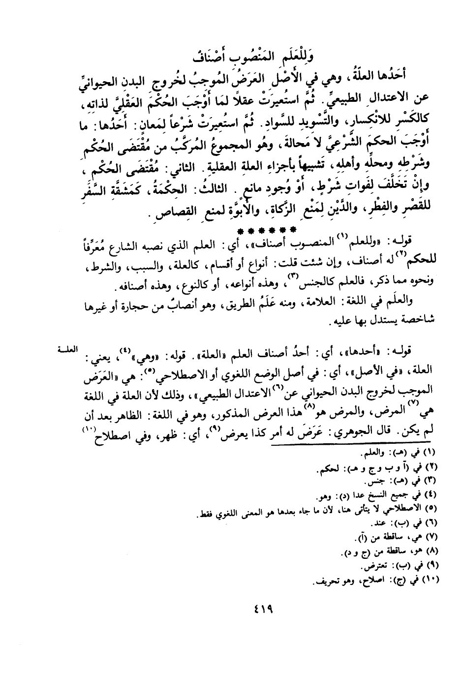 قَوْلُهُ: «أَحَدُهَا» ، أَيْ: أَحَدُ أَصْنَافِ الْعِلْمِ «الْعِلَّةُ» . قَوْلُهُ: «وَهِيَ» ، يَعْنِي: الْعِلَّةَ، «فِي الْأَصْلِ» ، أَيْ: فِي أَصْلِ الْوَضْعِ اللُّغَوِيِّ أَوِ الِاصْطِلَاحِيِّ: هِيَ «الْعَرَضُ الْمُوجِبُ لِخُرُوجِ الْبَدَنِ الْحَيَوَانِيِّ عَنِ الِاعْتِدَالِ الطَّبِيعِيِّ» ، وَذَلِكَ لِأَنَّ الْعِلَّةَ فِي اللُّغَةِ هِيَ الْمَرَضُ، وَالْمَرَضُ هُوَ هَذَا الْعَرَضُ الْمَذْكُورُ، وَهُوَ فِي اللُّغَةِ: الظَّاهِرُ بَعْدَ أَنْ لَمْ يَكُنْ. قَالَ الْجَوْهَرِيُّ: عَرَضَ لَهُ أَمْرُ كَذَا يَعْرِضُ، أَيْ: ظَهَرَ، وَفِي اصْطِلَاحِ