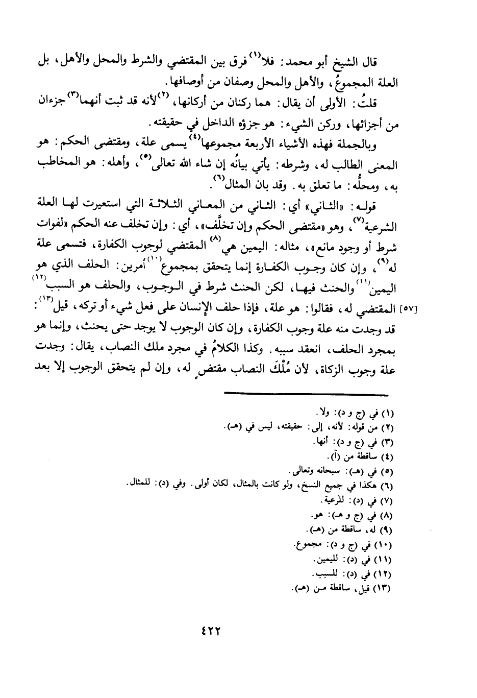 وَبِالْجُمْلَةِ فَهَذِهِ الْأَشْيَاءُ الْأَرْبَعَةُ مَجْمُوعُهَا يُسَمَّى عِلَّةً، وَمُقْتَضَى الْحُكْمِ: هُوَ الْمَعْنَى الطَّالِبُ لَهُ، وَشَرْطُهُ: يَأْتِي بَيَانُهُ إِنْ شَاءَ اللَّهُ تَعَالَى، وَأَهْلُهُ: هُوَ الْمُخَاطَبُ بِهِ، وَمَحَلُّهُ: مَا تَعَلَّقَ بِهِ. وَقَدْ بَانَ الْمِثَالُ.