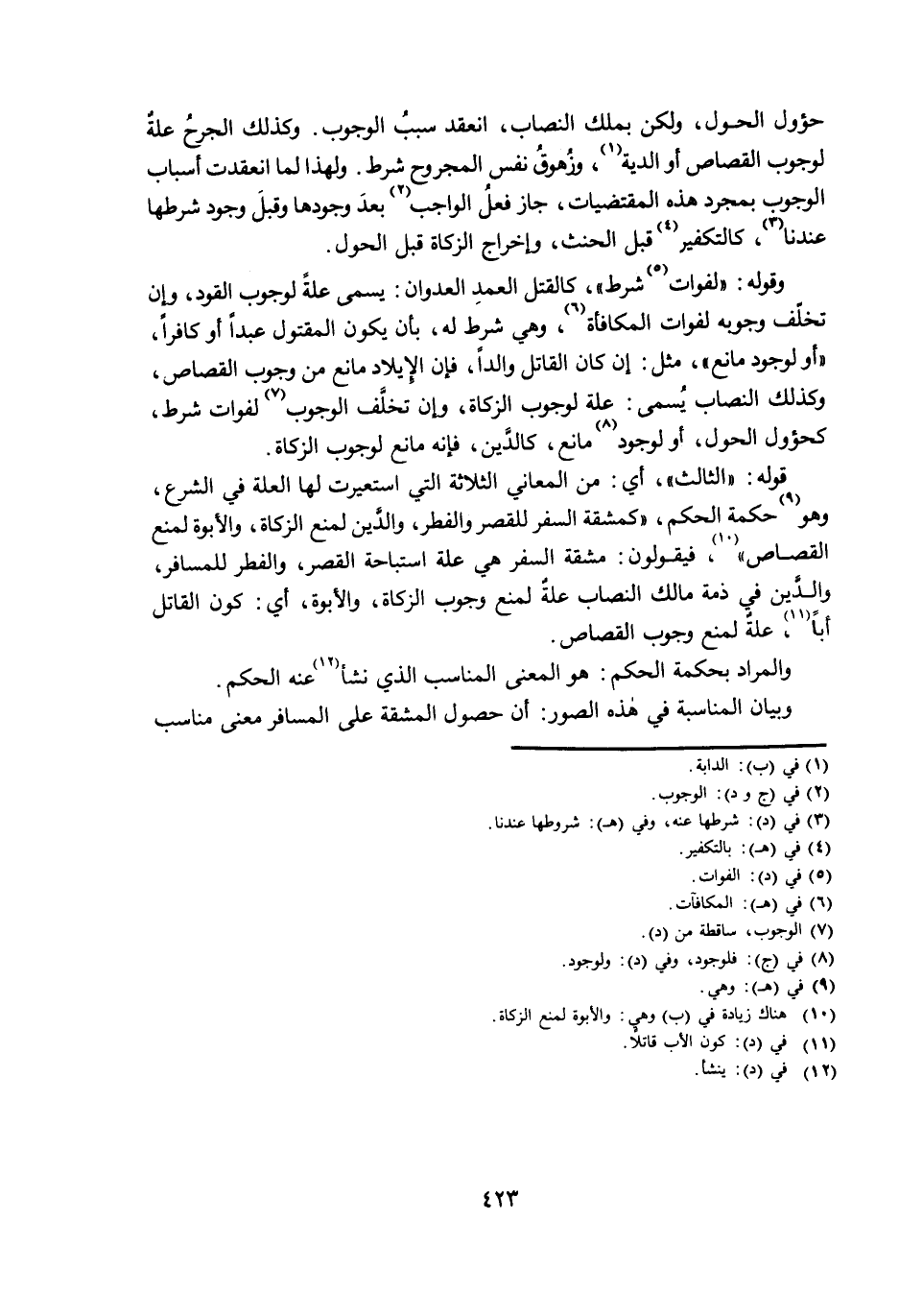 وَقَوْلُهُ: «لِفَوَاتِ شَرْطٍ» ، كَالْقَتْلِ الْعَمْدِ الْعُدْوَانِ: يُسَمَّى عِلَّةً لِوُجُوبِ الْقَوَدِ، وَإِنْ تَخَلَّفَ وُجُوبُهُ لِفَوَاتِ الْمُكَافَأَةِ، وَهِيَ شَرْطٌ لَهُ، بِأَنْ يَكُونَ الْمَقْتُولُ عَبْدًا أَوْ كَافِرًا، «أَوْ لِوُجُودِ مَانِعٍ» ، مِثْلِ: إِنْ كَانَ الْقَاتِلُ وَالِدًا، فَإِنَّ الْإِيلَادَ مَانِعٌ مِنْ وُجُوبِ الْقِصَاصِ، وَكَذَلِكَ النِّصَابُ يُسَمَّى: عِلَّةٌ لِوُجُوبِ الزَّكَاةِ، وَإِنْ تَخَلَّفَ الْوُجُوبُ لِفَوَاتِ شَرْطٍ، كَحُؤُولِ الْحَوْلِ، أَوْ لِوُجُودِ مَانِعٍ، كَالدَّيْنِ، فَإِنَّهُ مَانِعٌ لِوُجُوبِ الزَّكَاةِ.