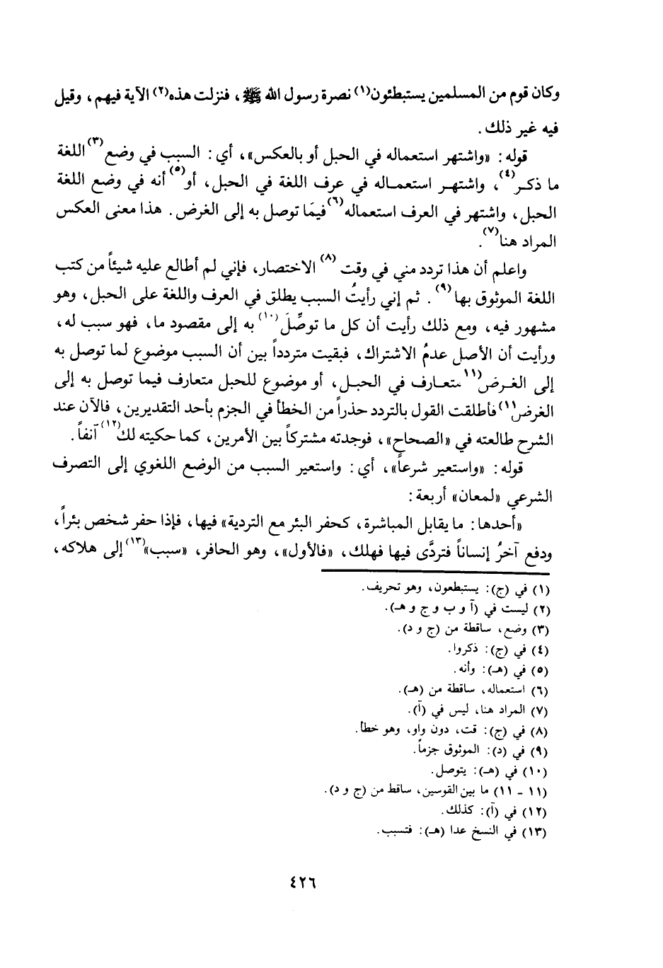 وَاعْلَمْ أَنَّ هَذَا تَرَدُّدٌ فِي وَقْتِ الِاخْتِصَارِ، فَإِنِّي لَمْ أُطَالِعْ عَلَيْهِ شَيْئًا مِنْ كُتُبِ اللُّغَةِ الْمَوْثُوقِ بِهَا. ثُمَّ إِنِّي رَأَيْتُ السَّبَبَ يُطْلَقُ فِي الْعُرْفِ وَاللُّغَةِ عَلَى الْحَبْلِ، وَهُوَ مَشْهُورٌ فِيهِ، وَمَعَ ذَلِكَ رَأَيْتُ أَنَّ كُلَّ مَا تُوُصِّلَ بِهِ إِلَى مَقْصُودٍ مَا، فَهُوَ سَبَبٌ لَهُ، وَرَأَيْتُ أَنَّ الْأَصْلَ عَدَمُ الِاشْتِرَاكِ، فَبَقِيتُ مُتَرَدِّدًا بَيْنَ أَنَّ السَّبَبَ مَوْضُوعٌ لِمَا تُوُصِّلُ بِهِ إِلَى الْغَرَضِ مُتَعَارَفٌ فِي الْحَبْلِ، أَوْ مَوْضُوعٌ لِلْحَبْلِ مُتَعَارَفٌ فِيمَا تُوُصِّلَ بِهِ إِلَى الْغَرَضِ فَأَطْلَقْتُ الْقَوْلَ بِالتَّرَدُّدِ حَذَرًا مِنَ الْخَطَأِ فِي الْجَزْمِ بِأَحَدِ التَّقْدِيرَيْنِ، فَالْآنَ عِنْدَ الشَّرْحِ طَالَعْتُهُ فِي «الصِّحَاحِ» ، فَوَجَدْتُهُ مُشْتَرَكًا بَيْنَ الْأَمْرَيْنِ، كَمَا حَكَيْتُهُ لَكَ آنِفًا.