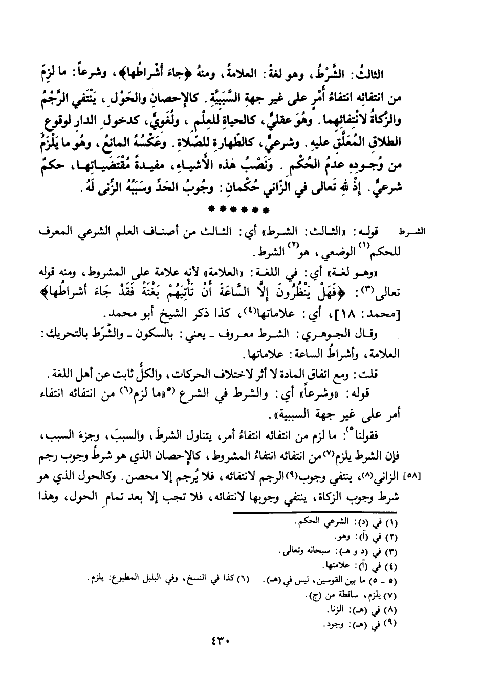 الثَّالِثُ: الشَّرْطُ، وَهُوَ لُغَةً: الْعَلَامَةُ، وَمِنْهُ {جَاءَ أَشْرَاطُهَا} ، وَشَرْعًا: مَا لَزِمَ مِنِ انْتِفَائِهِ انْتِفَاءُ أَمْرٍ عَلَى غَيْرِ جِهَةِ السَّبَبِيَّةِ. كَالْإِحْصَانِ وَالْحَوْلِ، يَنْتَفِي الرَّجْمُ وَالزَّكَاةُ لِانْتِفَائِهِمَا. وَهُوَ عَقْلِيٌّ، كَالْحَيَاةِ لِلْعِلْمِ، وَلُغَوِيٌّ، كَدُخُولِ الدَّارِ لِوُقُوعِ الطَّلَاقِ الْمُعَلَّقِ عَلَيْهِ. وَشَرْعِيٌّ، كَالطَّهَارَةِ لِلصَّلَاةِ. وَعَكْسُهُ الْمَانِعُ، وَهُوَ مَا يَلْزَمُ مِنْ وُجُودِهِ عَدَمُ الْحُكْمِ. وَنَصْبُ هَذِهِ الْأَشْيَاءِ، مُفِيدَةً مُقْتَضَيَاتِهَا، حُكْمٌ شَرْعِيٌّ. إِذْ لِلَّهِ تَعَالَى فِي الزَّانِي حُكْمَانِ: وُجُوبُ الْحَدِّ وَسَبَبُهُ الزِّنَى لَهُ.