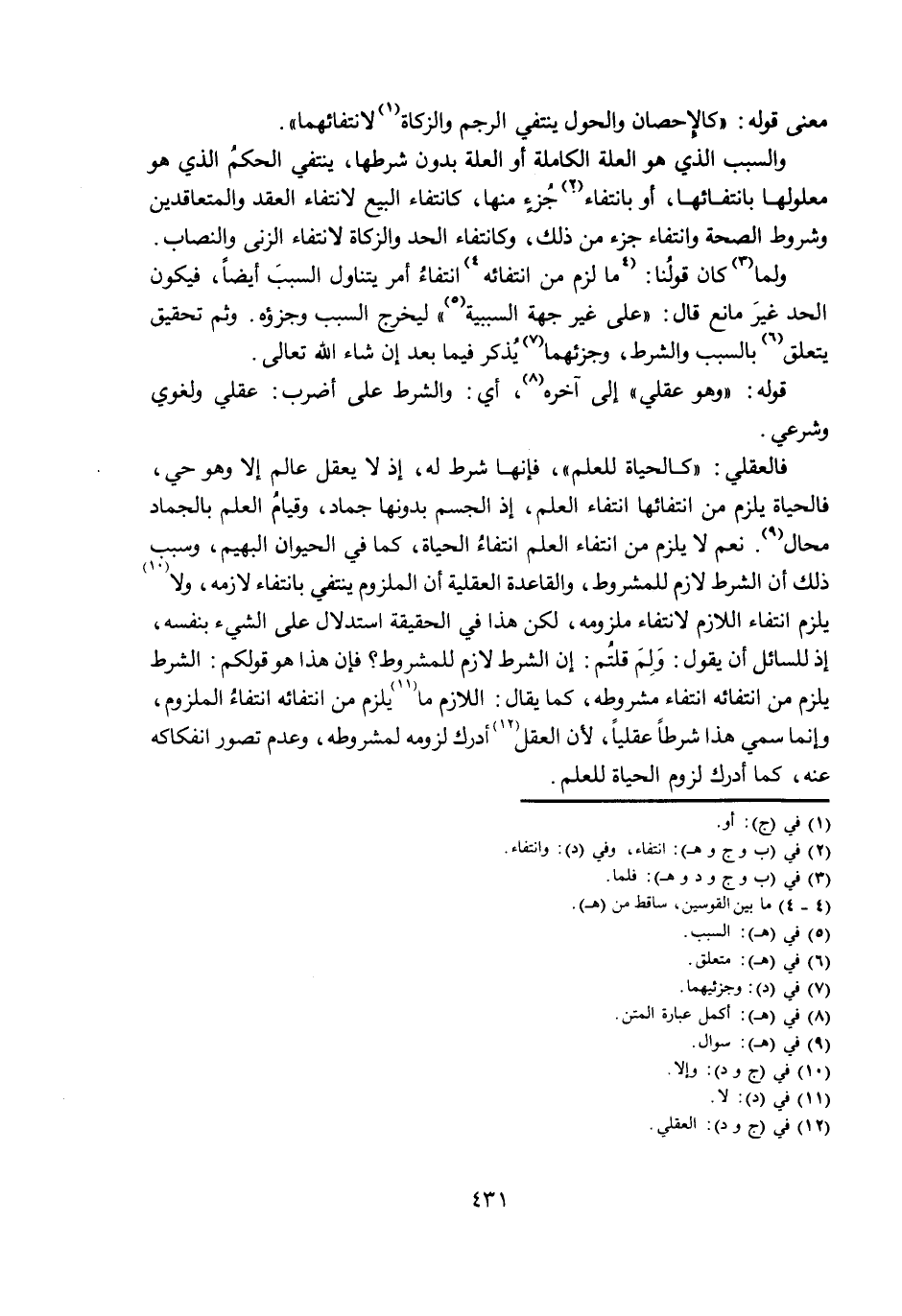 فَالْعَقْلِيُّ: «كَالْحَيَاةِ لِلْعِلْمِ» ، فَإِنَّهَا شَرْطٌ لَهُ، إِذْ لَا يَعْقِلُ عَالِمٌ إِلَّا وَهُوَ حَيٌّ، فَالْحَيَاةُ يَلْزَمُ مِنِ انْتِفَائِهَا انْتِفَاءُ الْعِلْمِ، إِذِ الْجِسْمُ بِدُونِهَا جَمَادٌ، وَقِيَامُ الْعِلْمِ بِالْجَمَادِ مُحَالٌ. نَعَمْ لَا يَلْزَمُ مِنِ انْتِفَاءِ الْعِلْمِ انْتِفَاءُ الْحَيَاةِ، كَمَا فِي الْحَيَوَانِ الْبَهِيمِ، وَسَبَبُ ذَلِكَ أَنَّ الشَّرْطَ لَازِمٌ لِلْمَشْرُوطِ، وَالْقَاعِدَةُ الْعَقْلِيَّةُ أَنَّ الْمَلْزُومَ يَنْتَفِي بِانْتِفَاءِ لَازِمِهِ، وَلَا يَلْزَمُ انْتِفَاءُ اللَّازِمِ لِانْتِفَاءِ مَلْزُومِهِ، لَكِنَّ هَذَا فِي الْحَقِيقَةِ اسْتِدْلَالٌ عَلَى الشَّيْءِ بِنَفْسِهِ، إِذْ لِلسَّائِلِ أَنْ يَقُولَ: وَلِمَ قُلْتُمْ: إِنَّ الشَّرْطَ لَازِمٌ لِلْمَشْرُوطِ؟ فَإِنَّ هَذَا هُوَ قَوْلُكُمْ: الشَّرْطُ يَلْزَمُ مِنِ انْتِفَائِهِ انْتِفَاءُ مَشْرُوطِهِ، كَمَا يُقَالُ: اللَّازِمُ مَا يَلْزَمُ مِنَ انْتِفَائِهِ انْتِفَاءُ الْمَلْزُومِ، وَإِنَّمَا سُمِّيَ هَذَا شَرْطًا عَقْلِيًّا، لِأَنَّ الْعَقْلَ أَدْرَكَ لُزُومَهُ لِمَشْرُوطِهِ، وَعَدَمَ تَصَوُّرِ انْفِكَاكِهِ عَنْهُ، كَمَا أَدْرَكَ لُزُومَ الْحَيَاةِ لِلْعِلْمِ.