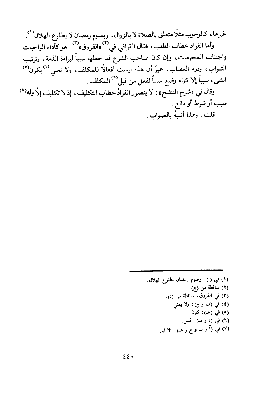غَيْرِهَا، كَالْوُجُوبِ مَثَلًا مُتَعَلِّقٌ بِالصَّلَاةِ لَا بِالزَّوَالِ، وَبِصَوْمِ رَمَضَانَ لَا بِطُلُوعِ الْهِلَالِ. وَأَمَّا انْفِرَادُ خِطَابِ الطَّلَبِ، فَقَالَ الْقَرَافِيُّ فِي «الْفُرُوقِ» : هُوَ كَأَدَاءِ الْوَاجِبَاتِ وَاجْتِنَابِ الْمُحَرَّمَاتِ، وَإِنْ كَانَ صَاحِبُ الشَّرْعِ قَدْ جَعَلَهَا سَبَبًا لِبَرَاءَةِ الذِّمَّةِ، وَتَرْتِيبِ الثَّوَابِ، وَدَرْءِ الْعِقَابِ، غَيْرَ أَنَّ هَذِهِ لَيْسَتْ أَفْعَالًا لِلْمُكَلَّفِ، وَلَا نَعْنِي بِكَوْنِ الشَّيْءِ سَبَبًا إِلَّا كَوْنَهُ وُضِعَ سَبَبًا لِفِعْلٍ مِنْ قِبَلِ الْمُكَلِّفِ.