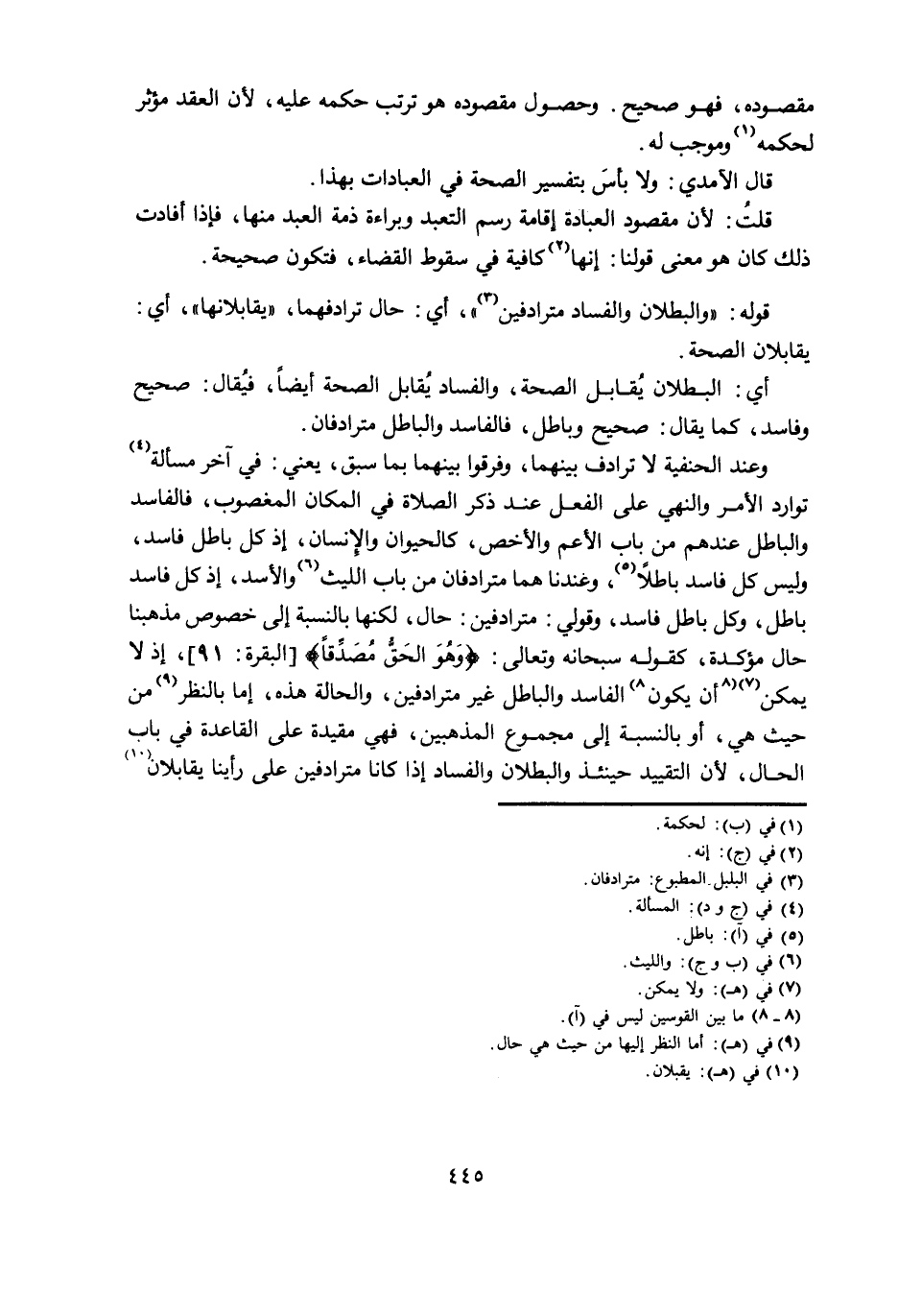 وَعِنْدَ الْحَنَفِيَّةِ لَا تَرَادُفَ بَيْنِهِمَا، وَفَرَّقُوا بَيْنَهُمَا بِمَا سَبَقَ، يَعْنِي: فِي آخِرِ مَسْأَلَةِ تَوَارُدِ الْأَمْرِ وَالنَّهْيِ عَلَى الْفِعْلِ عِنْدَ ذِكْرِ الصَّلَاةِ فِي الْمَكَانِ الْمَغْصُوبِ، فَالْفَاسِدُ وَالْبَاطِلُ عِنْدَهُمْ مِنْ بَابِ الْأَعَمِّ وَالْأَخَصِّ، كَالْحَيَوَانِ وَالْإِنْسَانِ، إِذْ كُلُّ بَاطِلٍ فَاسِدٌ، وَلَيْسَ كُلُّ فَاسِدٍ بَاطِلًا، وَعِنْدَنَا هُمَا مُتَرَادِفَانِ مِنْ بَابِ اللَّيْثِ وَالْأَسَدِ، إِذْ كُلُّ فَاسِدٍ بَاطِلٌ، وَكُلُّ بَاطِلٍ فَاسِدٌ، وَقَوْلِي: مُتَرَادِفَيْنِ: حَالٌ، لَكِنَّهَا بِالنِّسْبَةِ إِلَى خُصُوصِ مَذْهَبِنَا حَالٌ مُؤَكِّدَةٌ، كَقَوْلِهِ سُبْحَانَهُ وَتَعَالَى: {وَهُوَ الْحَقُّ مُصَدِّقًا} [الْبَقَرَةِ: 91] ، إِذْ لَا يُمْكِنُ أَنْ يَكُونَ الْفَاسِدُ وَالْبَاطِلُ غَيْرَ مُتَرَادِفَيْنِ، وَالْحَالَةُ هَذِهِ، إِمَّا بِالنَّظَرِ مِنْ حَيْثُ هِيَ، أَوْ بِالنِّسْبَةِ إِلَى مَجْمُوعِ الْمَذْهَبَيْنِ، فَهِيَ مُقَيَّدَةٌ عَلَى الْقَاعِدَةِ فِي بَابِ الْحَالِ، لِأَنَّ التَّقْيِيدَ حِينَئِذٍ وَالْبُطْلَانَ وَالْفَسَادَ إِذَا كَانَا مُتَرَادِفَيْنِ عَلَى رَأْيِنَا يُقَابِلَانِ