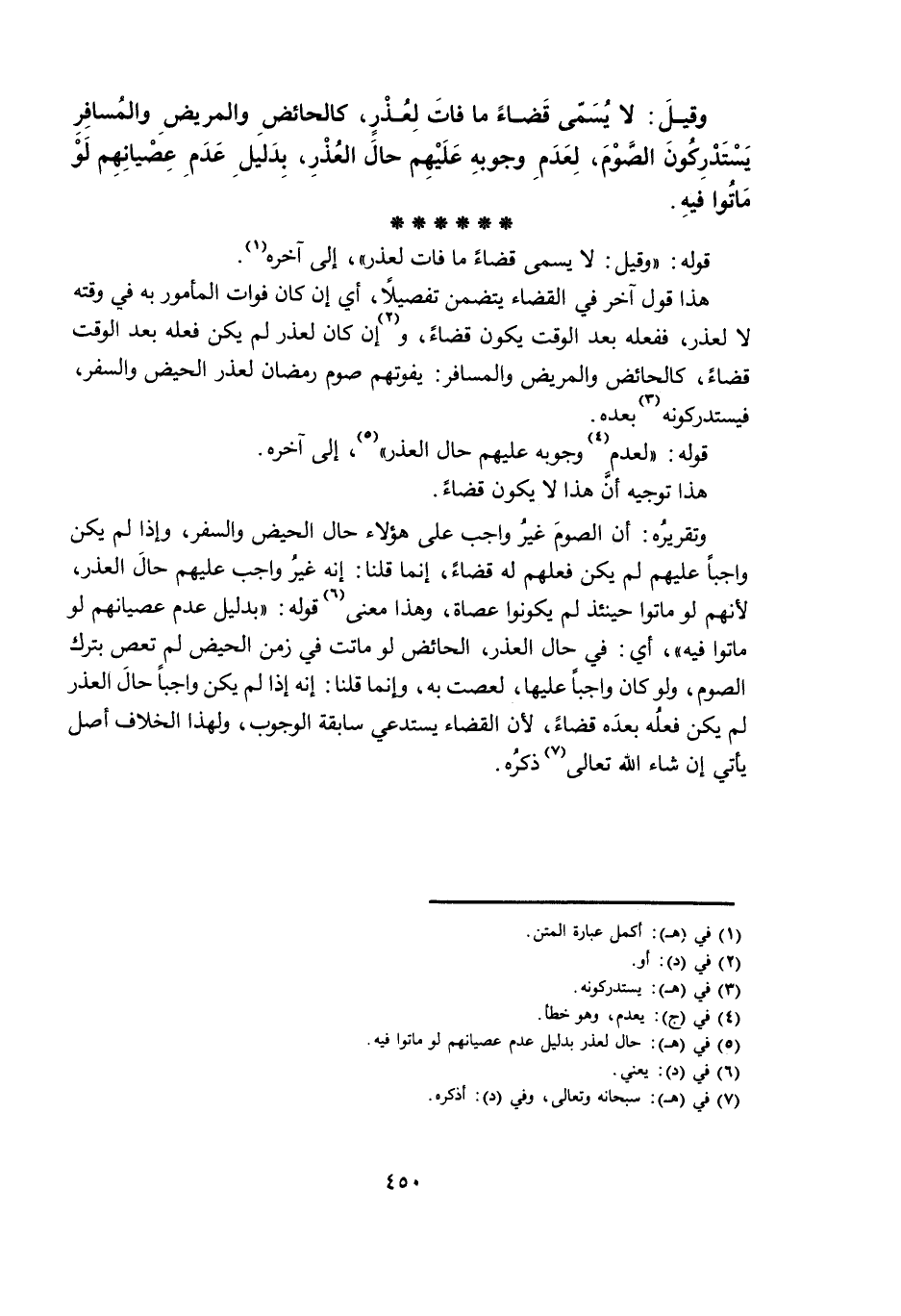 وَقِيلَ: لَا يُسَمَّى قَضَاءً مَا فَاتَ لِعُذْرٍ، كَالْحَائِضِ وَالْمَرِيضِ وَالْمُسَافِرِ يَسْتَدْرِكُونَ الصَّوْمَ، لِعَدَمِ وُجُوبِهِ عَلَيْهِمْ حَالَ الْعُذْرِ، بِدَلِيلِ عَدَمِ عِصْيَانِهِمْ لَوْ مَاتُوا فِيهِ.