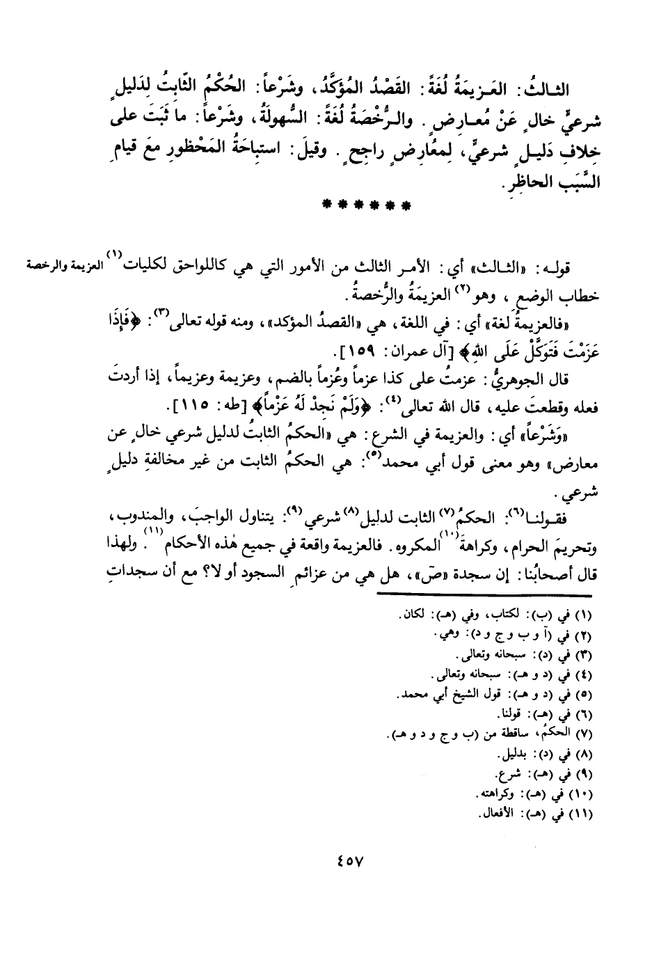 فَقَوْلُنَا: الْحُكْمُ الثَّابِتُ لِدَلِيلٍ شَرْعِيٍّ: يَتَنَاوَلُ الْوَاجِبَ، وَالْمَنْدُوبَ، وَتَحْرِيمَ الْحَرَامِ، وَكَرَاهَةَ الْمَكْرُوهِ. فَالْعَزِيمَةُ وَاقِعَةٌ فِي جَمِيعِ هَذِهِ الْأَحْكَامِ. وَلِهَذَا قَالَ أَصْحَابُنَا: إِنَّ سَجْدَةَ (ص) ، هَلْ هِيَ مِنْ عَزَائِمِ السُّجُودِ أَوْ لَا؟ مَعَ أَنَّ سَجَدَاتِ