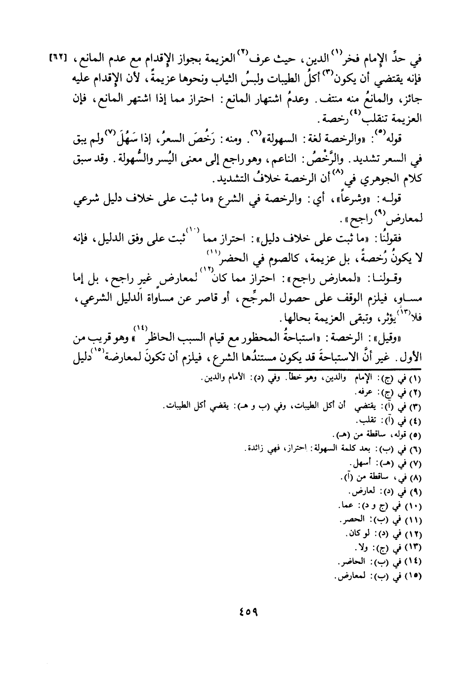 فِي حَدِّ الْإِمَامِ فَخْرِ الدِّينِ، حَيْثُ عَرَّفَ الْعَزِيمَةَ بِجَوَازِ الْإِقْدَامِ مَعَ عَدَمِ الْمَانِعِ، فَإِنَّهُ يَقْتَضِي أَنْ يَكُونَ أَكْلُ الطَّيِّبَاتِ وَلُبْسُ الثِّيَابِ وَنَحْوُهَا عَزِيمَةً، لِأَنَّ الْإِقْدَامَ عَلَيْهِ جَائِزٌ، وَالْمَانِعَ مِنْهُ مُنْتَفٍ. وَعَدَمُ اشْتِهَارِ الْمَانِعِ: احْتِرَازٌ مِمَّا إِذَا اشْتَهَرَ الْمَانِعُ، فَإِنَّ الْعَزِيمَةَ تَنْقَلِبُ رُخْصَةً.