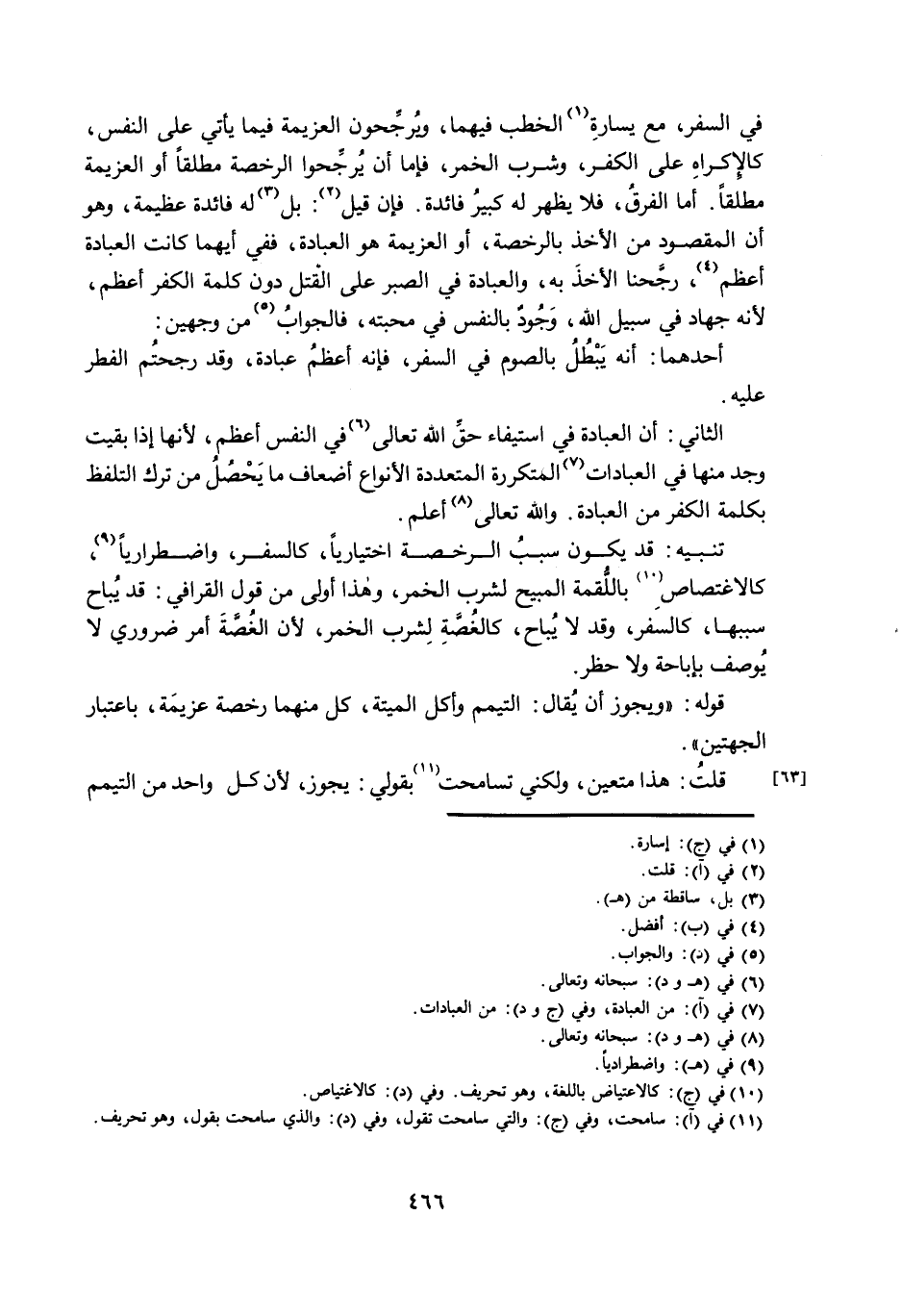 فِي السَّفَرِ، مَعَ يَسَارَةِ الْخَطْبِ فِيهِمَا، وَيُرَجِّحُونَ الْعَزِيمَةَ فِيمَا يَأْتِي عَلَى النَّفْسِ، كَالْإِكْرَاهِ عَلَى الْكُفْرِ، وَشُرْبِ الْخَمْرِ، فَإِمَّا أَنْ يُرَجِّحُوا الرُّخْصَةَ مُطْلَقًا أَوِ الْعَزِيمَةَ مُطْلَقًا. أَمَّا الْفَرْقُ، فَلَا يَظْهَرُ لَهُ كَبِيرُ فَائِدَةٍ. فَإِنْ قِيلَ: بَلْ لَهُ فَائِدَةٌ عَظِيمَةٌ، وَهُوَ أَنَّ الْمَقْصُودَ مِنَ الْأَخْذِ بِالرُّخْصَةِ، أَوِ الْعَزِيمَةِ هُوَ الْعِبَادَةُ، فَفِي أَيِّهِمَا كَانَتِ الْعِبَادَةُ أَعْظَمَ، رَجَّحْنَا الْأَخْذَ بِهِ، وَالْعِبَادَةُ فِي الصَّبْرِ عَلَى الْقَتْلِ دُونَ كَلِمَةِ الْكُفْرِ أَعْظَمُ، لِأَنَّهُ جِهَادٌ فِي سَبِيلِ اللَّهِ، وُجُودٌ بِالنَّفْسِ فِي مَحَبَّتِهِ، فَالْجَوَابُ مِنْ وَجْهَيْنِ: