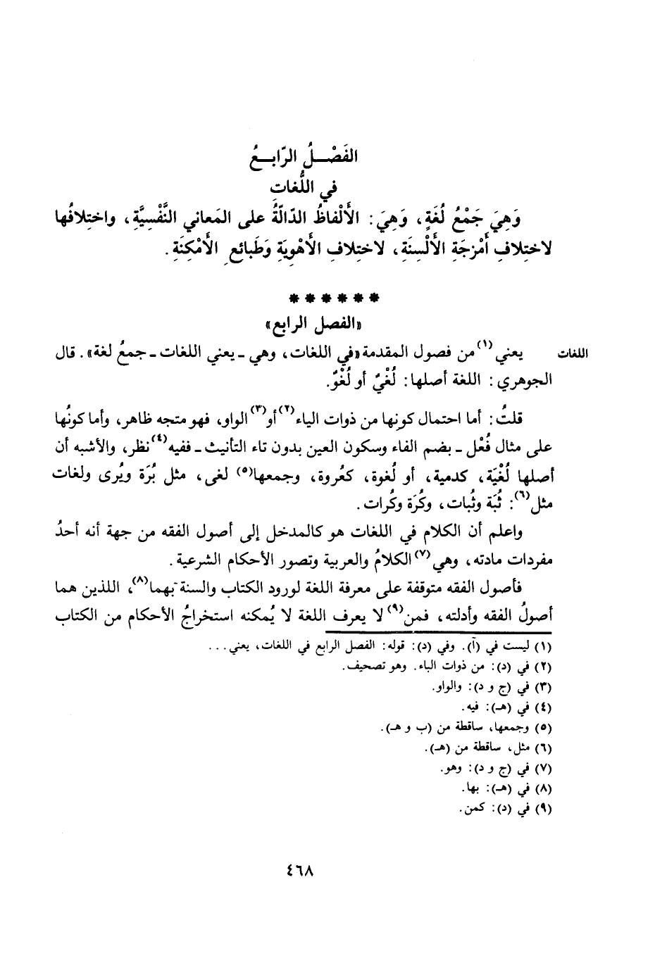 وَاعْلَمْ أَنَّ الْكَلَامَ فِي اللُّغَاتِ هُوَ كَالْمَدْخَلِ إِلَى أُصُولِ الْفِقْهِ مِنْ جِهَةِ أَنَّهُ أَحَدُ مُفْرَدَاتِ مَادَّتِهِ، وَهِيَ الْكَلَامُ وَالْعَرَبِيَّةُ وَتَصَوُّرُ الْأَحْكَامِ الشَّرْعِيَّةِ.