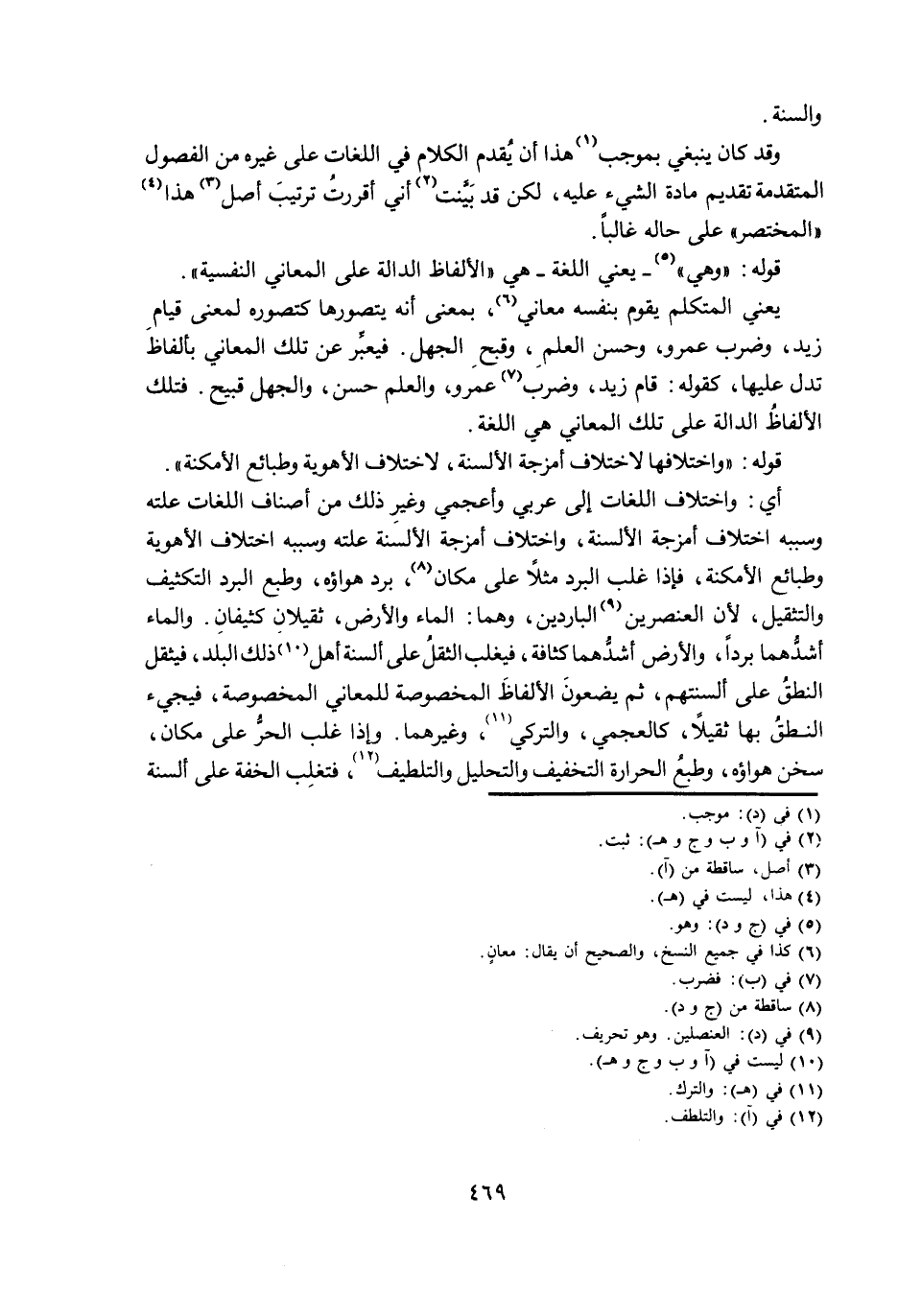 أَيْ: وَاخْتِلَافُ اللُّغَاتِ إِلَى عَرَبِيٍّ وَأَعْجَمِيٍّ وَغَيْرِ ذَلِكَ مِنْ أَصْنَافِ اللُّغَاتِ عِلَّتُهُ وَسَبَبُهُ اخْتِلَافُ أَمْزِجَةِ الْأَلْسِنَةِ، وَاخْتِلَافُ أَمْزِجَةِ الْأَلْسِنَةِ عِلَّتُهُ وَسَبَبُهُ اخْتِلَافُ الْأَهْوِيَةِ وَطَبَائِعِ الْأَمْكِنَةِ، فَإِذَا غَلَبَ الْبَرْدُ مَثَلًا عَلَى مَكَانٍ، بَرُدَ هَوَاؤُهُ، وَطَبْعُ الْبَرْدِ التَّكْثِيفُ وَالتَّثْقِيلُ، لِأَنَّ الْعُنْصُرَيْنِ الْبَارِدَيْنِ، وَهُمَا: الْمَاءُ وَالْأَرْضُ، ثَقِيلَانِ كَثِيفَانِ. وَالْمَاءُ أَشَدُّهُمَا بَرْدًا، وَالْأَرْضُ أَشَدُّهُمَا كَثَافَةً، فَيَغْلِبُ الثِّقَلُ عَلَى أَلْسِنَةِ أَهْلِ ذَلِكَ الْبَلَدِ، فَيَثْقُلُ النُّطْقُ عَلَى أَلْسِنَتِهِمْ، ثُمَّ يَضَعُونَ الْأَلْفَاظَ الْمَخْصُوصَةَ لِلْمَعَانِي الْمَخْصُوصَةِ، فَيَجِيءُ النُّطْقُ بِهَا ثَقِيلًا، كَالْعَجَمِيِّ، وَالتُّرْكِيِّ، وَغَيْرِهِمَا. وَإِذَا غَلَبَ الْحَرُّ عَلَى مَكَانٍ، سَخُنَ هَوَاؤُهُ، وَطَبْعُ الْحَرَارَةِ التَّخْفِيفُ وَالتَّحْلِيلُ وَالتَّلْطِيفُ، فَتَغْلِبُ الْخِفَّةُ عَلَى أَلْسِنَةِ